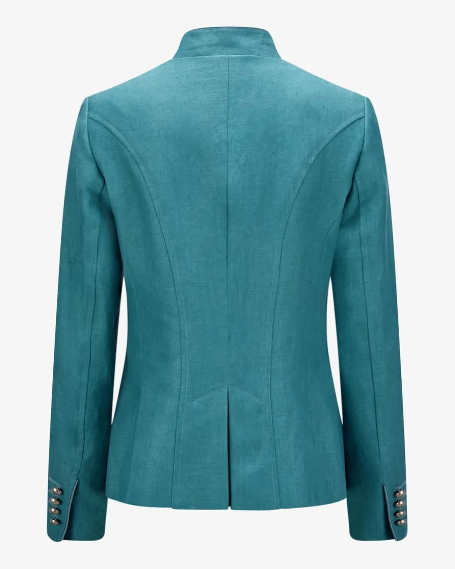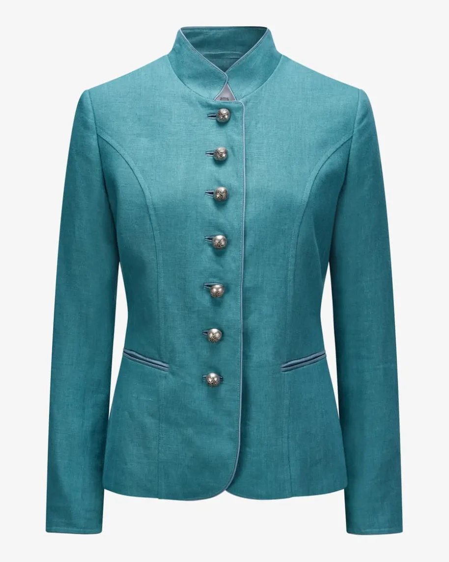 Bern Trachten-Leinenblazer für Damen von LODENFREY München 1842 in Türkis. Aushochwertiger Leinen-Qualität gefertigt, präsentiert sich das taillierte Modelldank toniger Paspelierungen, silberfarbener Kugel-Knöpfe sowie des klassischenDesigns in traditionell-authentischer Aufmachung.