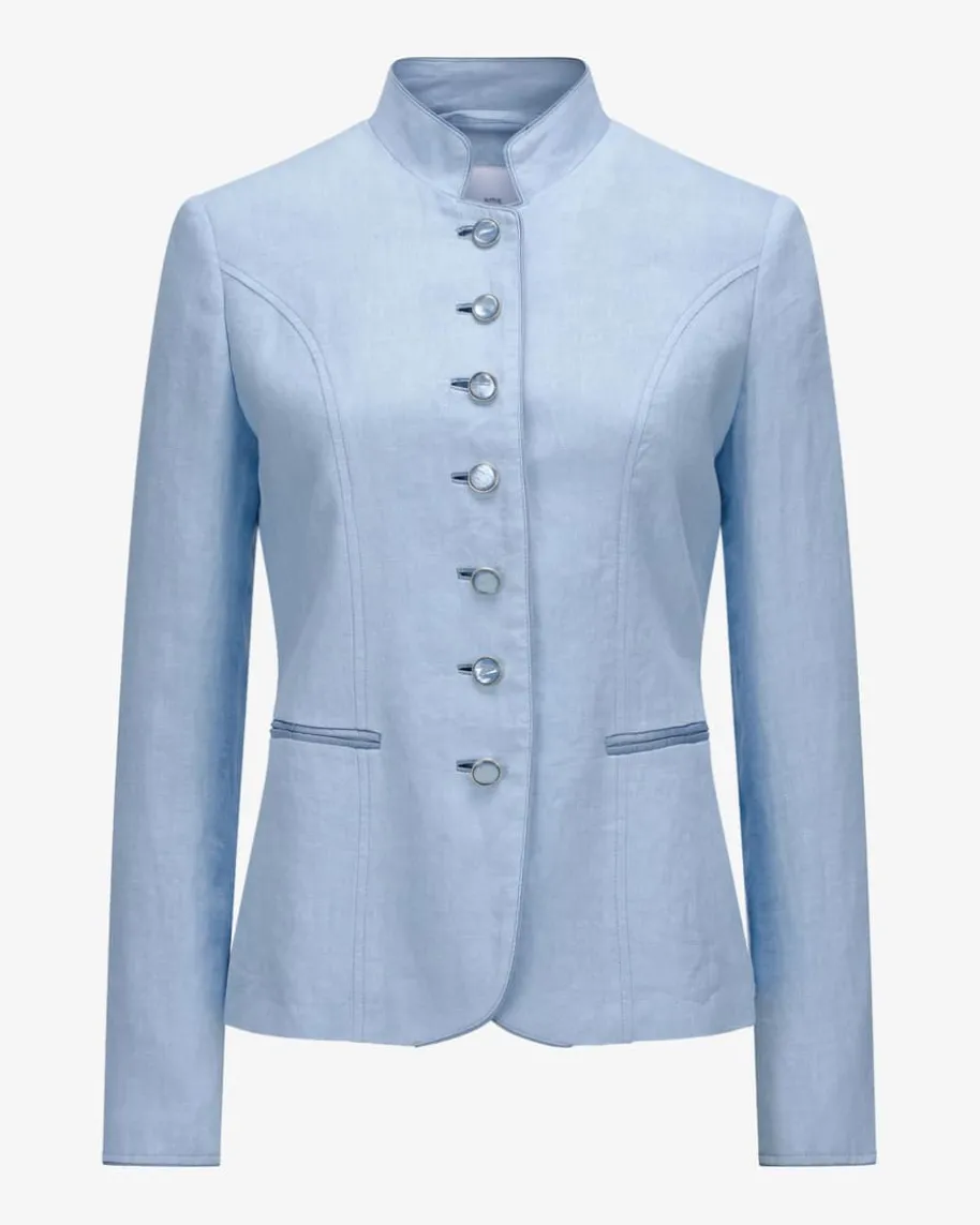 Bern Trachtenblazer für Damen von LODENFREY München 1842 in Hellblau. Aushochwertiger Leinen-Qualität gefertigt, präsentiert sich das taillierte Modelldank toniger Paspelierungen, changierender Knöpfe sowie des klassischen Designsin traditionell-authentischer Aufmachung.