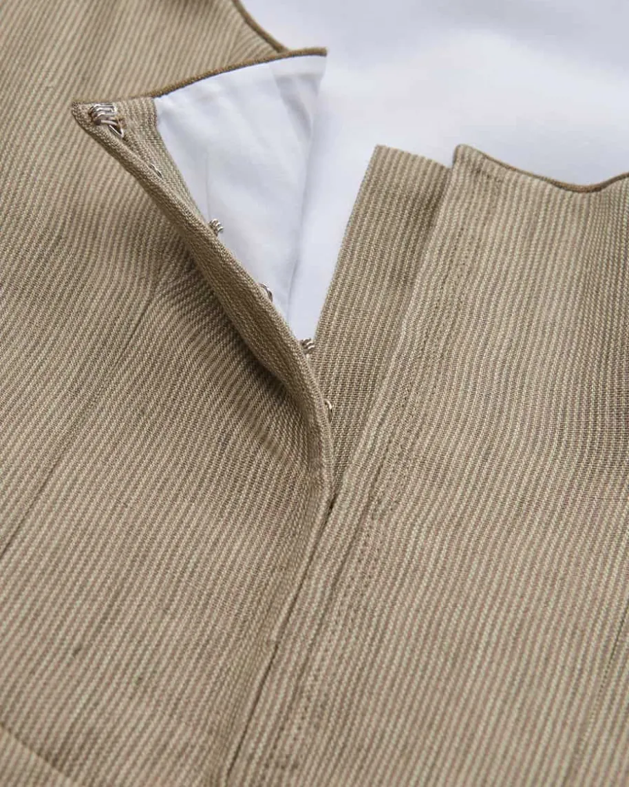 Bette Leinendirndl lang mit Sylvia Schürze für Damen von Tostmann in Taupe undWeiß. DasModell präsentiert sich dank strukturierter Leinen-Qualität mit feinem Streifen-Muster in femininer und zugleich traditioneller Aufmachung. Die tonale Schürzekomplettiert das minimalistische Trachten-Design gekonnt.