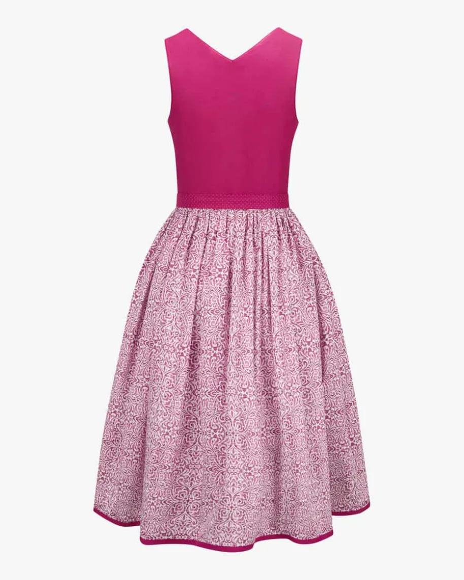 Bette Midi-Dirndl mit Schürze für Damen von Tostmann in Himbeere und Weiß.Trachten-Handwerk aus Österreich – Das Modell überzeugt durch den mit Ornamentengemusterten Rock und klassische Details, während die strukturierte Leinen-Qualität für angenehmen Tragekomfort sorgt. Die Schürze mit Allover-Pünktchen-Dessin rundet den Trachten-Look feminin ab.