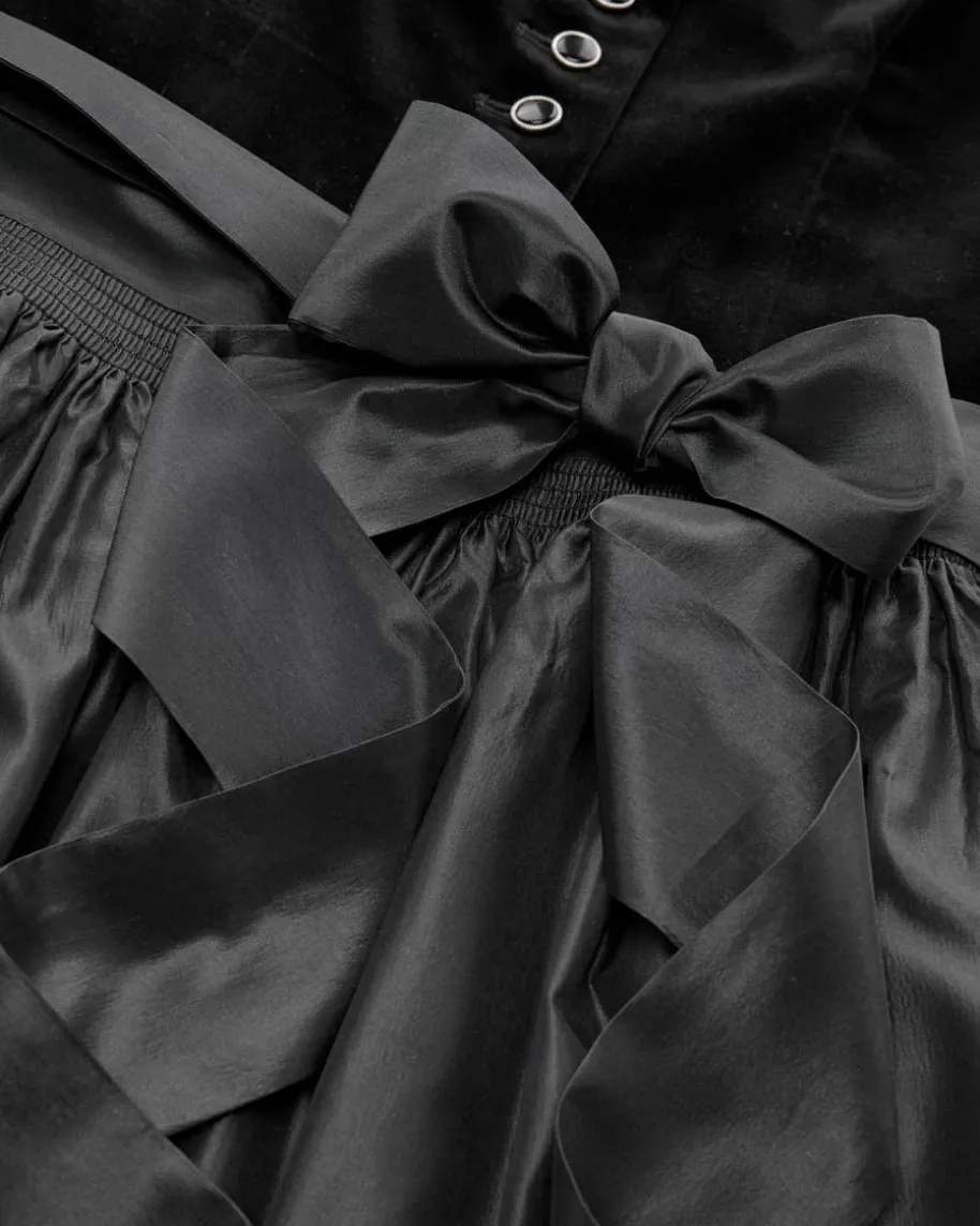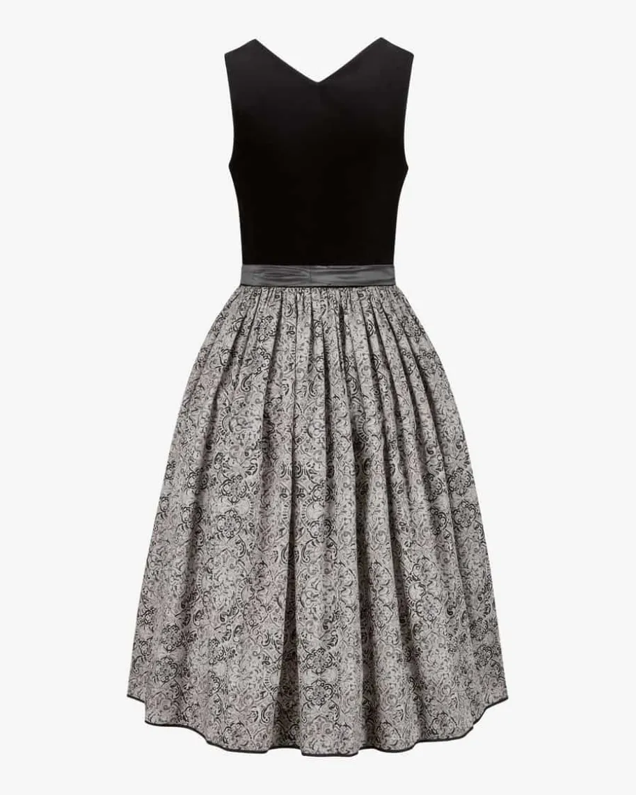 Biana Midi-Dirndl mit Schürze für Damen von Tostmann in Schwarz und Grau.Trachten-Handwerk aus Österreich – Das traditionelle Modell überzeugt mitweichem Samt-Mieder und gemustertem Baumwoll-Rock mit feinem Ornament-Print. Diechangierende Schürze aus hochwertiger Seide vervollständigt den Trachten-Lookstilvoll.