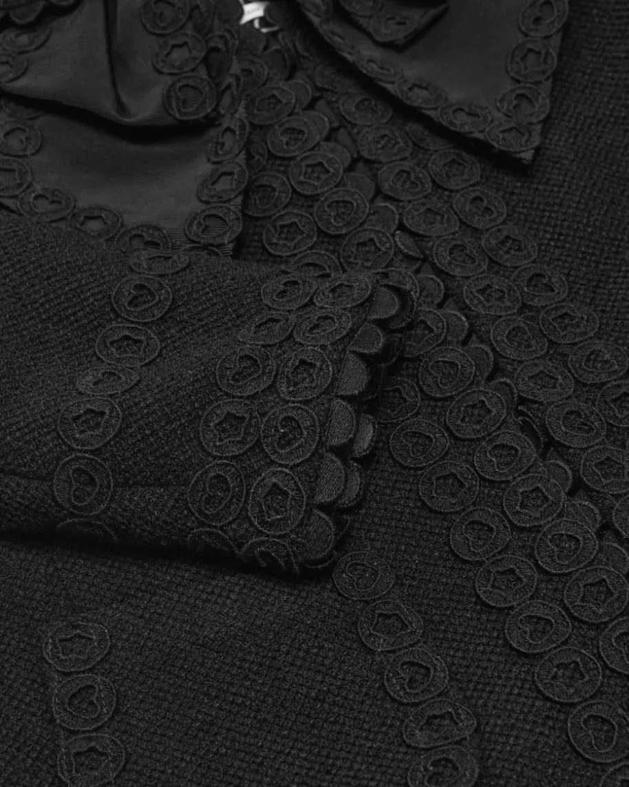Blazer für Damen von Maison Common in Schwarz. Das Label verkörpert Lebensfreudeund Esprit, die sich neben femininem Charme mit farbenfrohen Designs sowieMustern in den Kollektionen wiederfinden. Dieses Modell aus strukturiertemSchurwoll-Mix präsentiert sich in eleganter Blazerjacken-Silhouette mitSchulterwattierung, während die Häkelspitzen-Applikationen sowie das Schleifen-Detail einen stilvollen Look mit Dark Romance-Charakter kreieren.