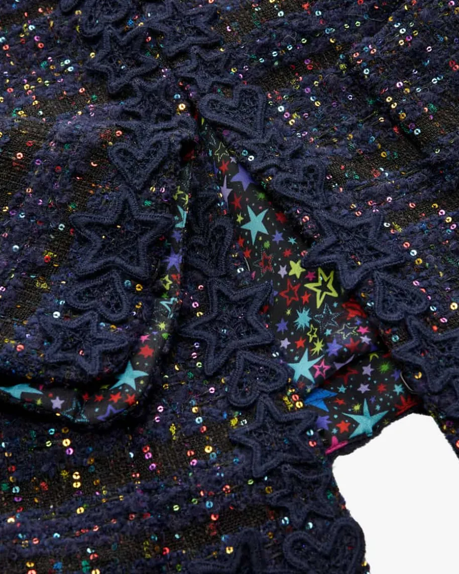 Blazer für Damen von Maison Common in Navy, Schwarz und Bunt. Der kastigeKurzblazer überzeugt mit edler Tweed-Optik aus angenehmer Woll-Mischung, währenddie bunten Pailletten und die originelle Spitzen-Borte verspielte Akzentesetzen. Das farbenfrohe Innenfutter mit Sternen-Muster verleiht den letztenSchliff.