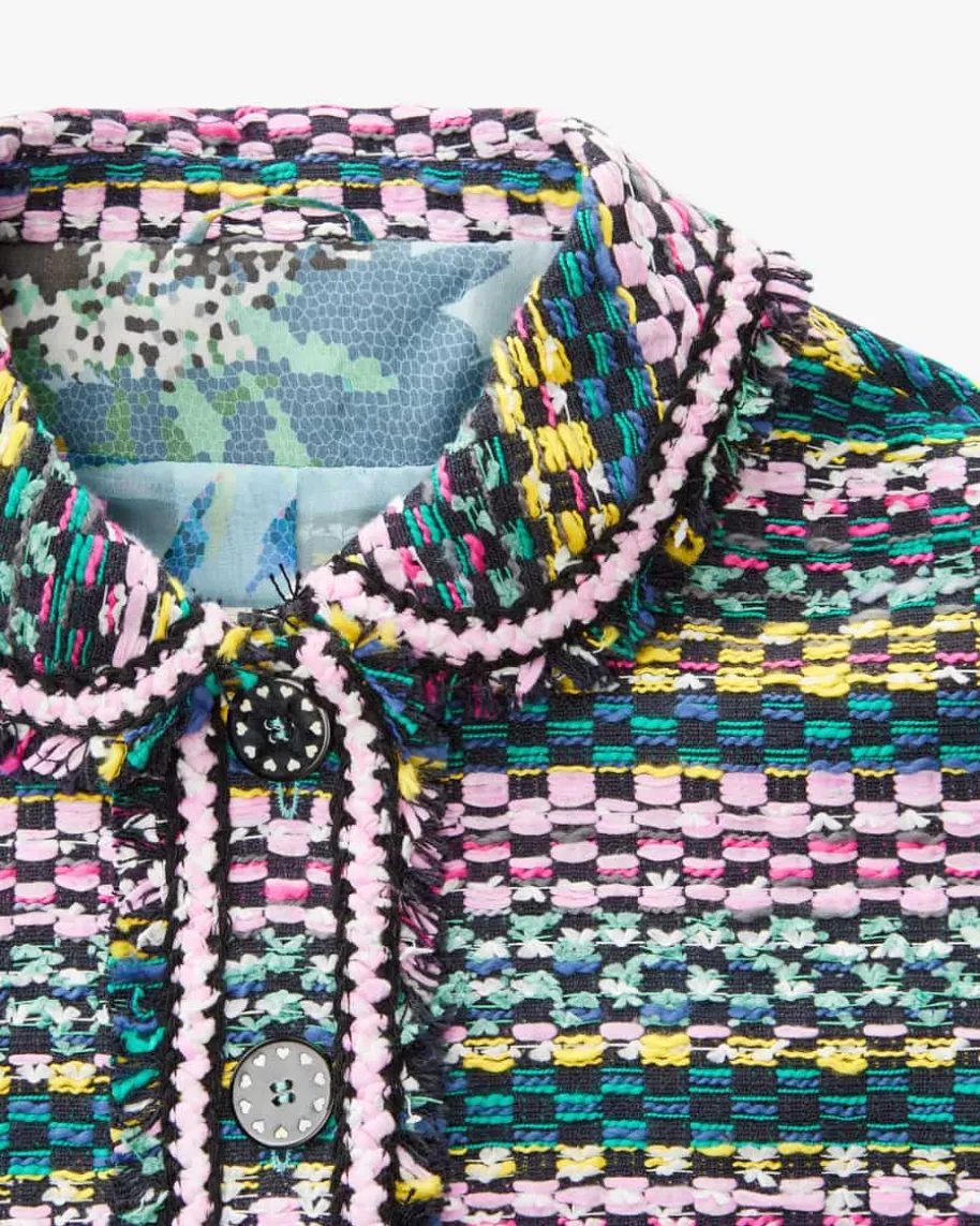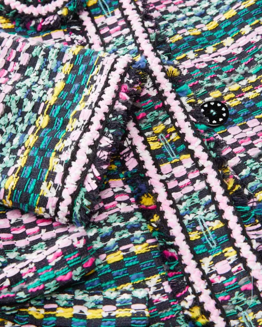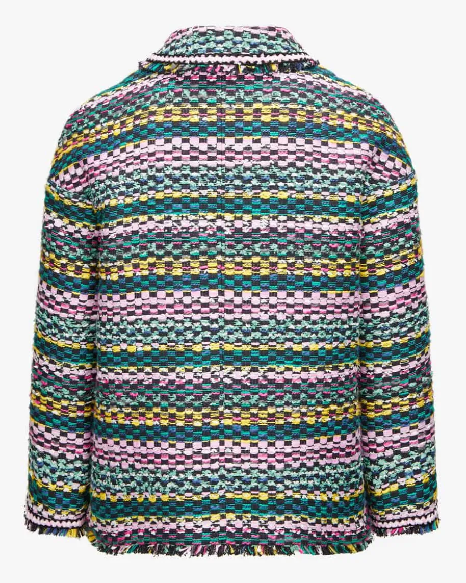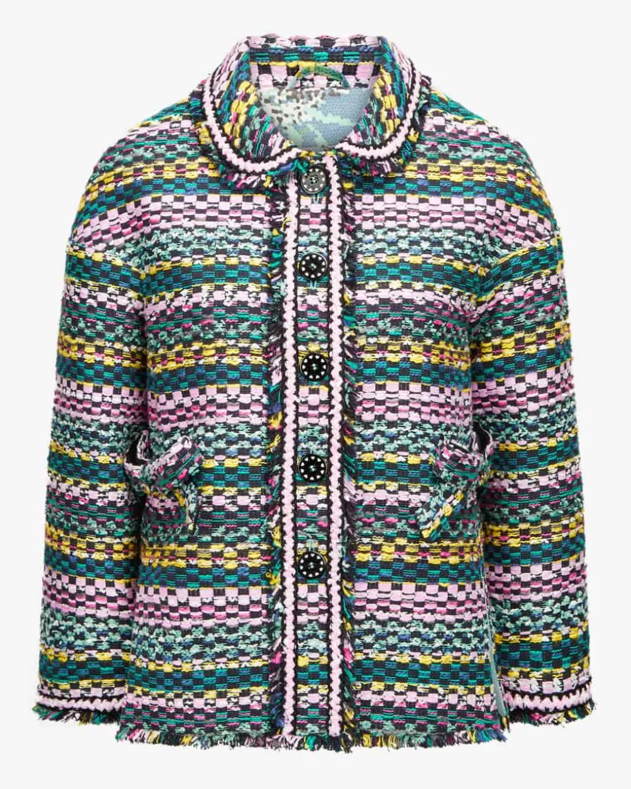 Blazer für Damen von Maison Common in Bunt. Das Label verkörpert Lebensfreudeund Esprit, die sich neben femininem Charme mit farbenfrohen Designs sowieMustern in den Kollektionen wiederfinden. Auch dieses Modell überzeugt dank derraffinierten Bouclé-Verarbeitung als modisches Highlight, während die feinenFransenborten und die femininen Schleifen-Applikationen ein fröhlich-stilvollesGesamtbild schafft.