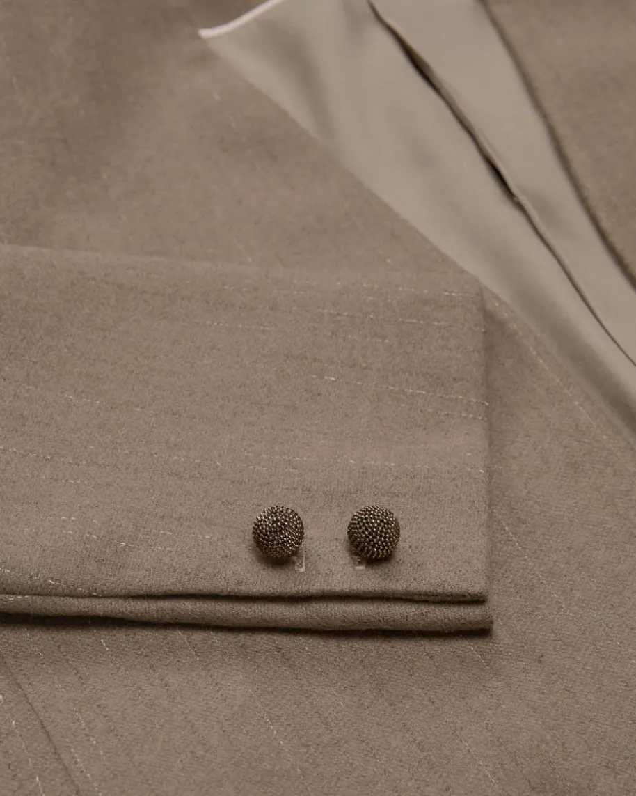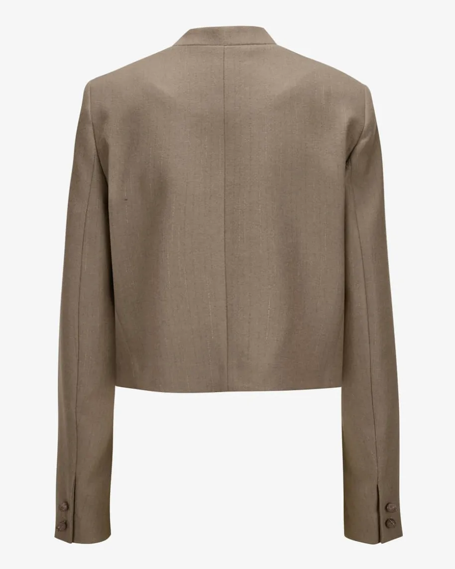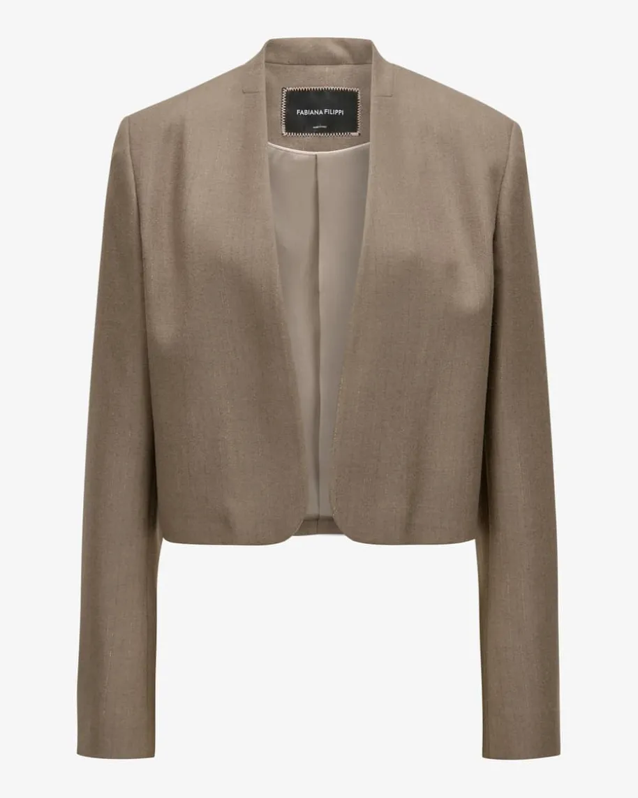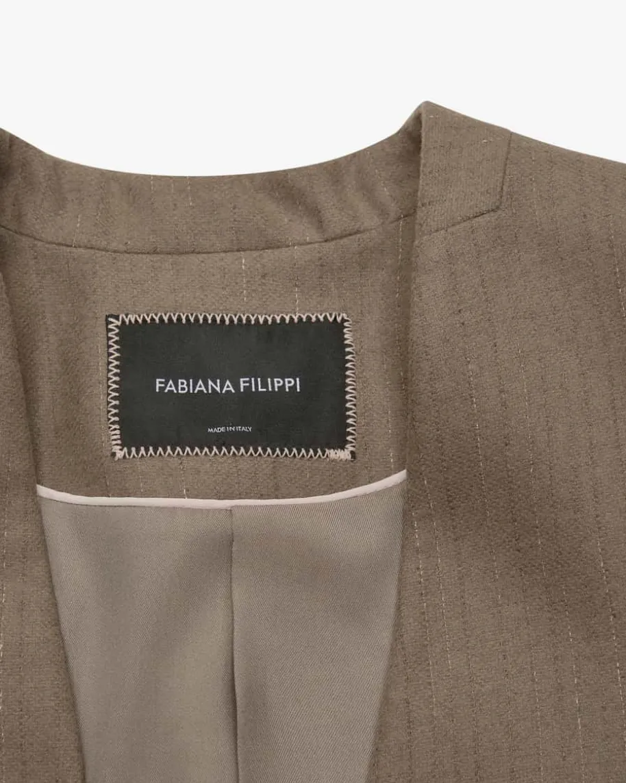 Blazer für Damen von Fabiana Filippi in Taupe. Die italienische Marke steht fürmoderne Eleganz, hochwertige Materialien und dezente Farbwelten. Auch diesesverkürzte Modell überzeugt sowohl haptisch als auch optisch mit weichemMerinowolle-Mix und feinen Webstreifen, während die raffinierten, changierendenKnöpfe einen eleganten Look schaffen.