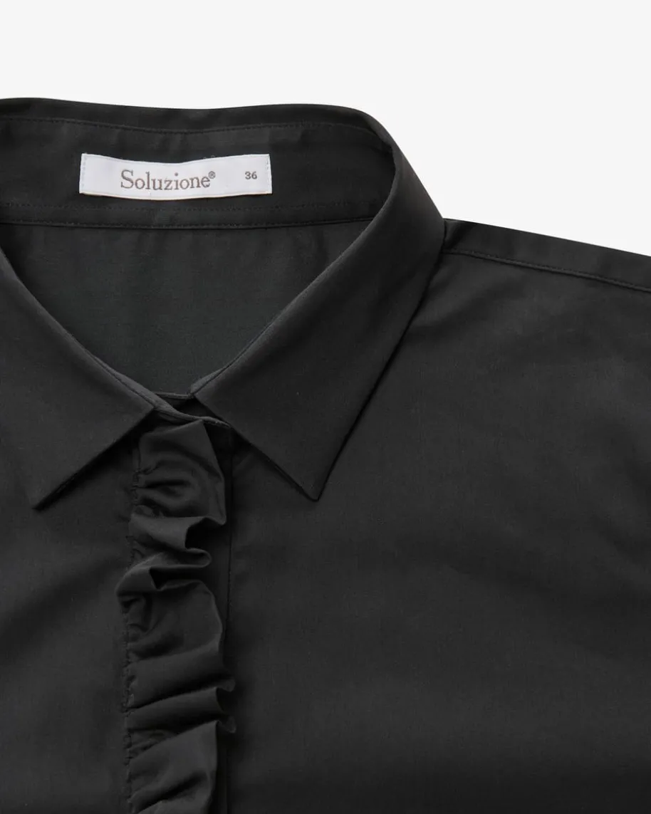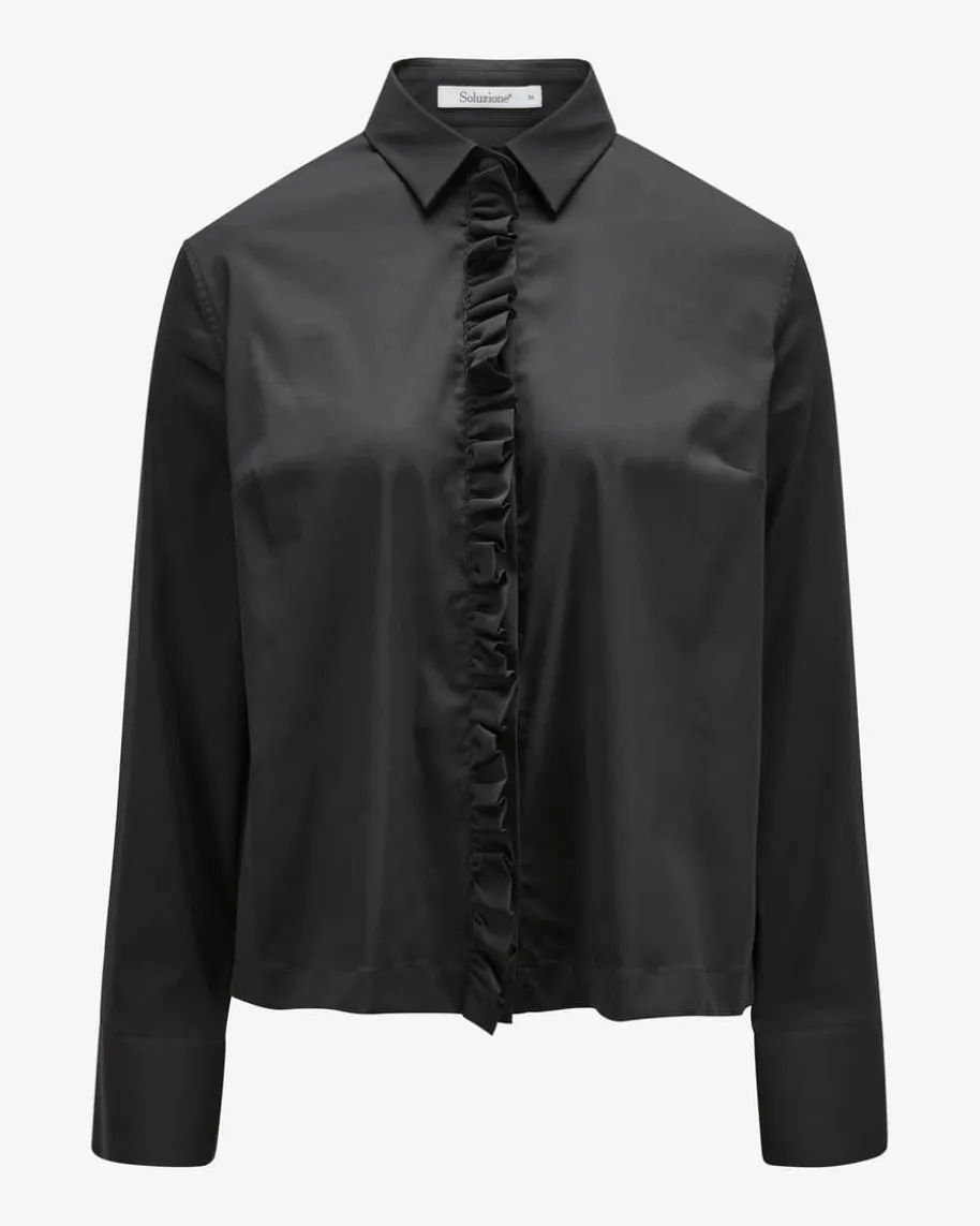 Bluse für Damen von Soluzione in Weiß. Das deutsche Label bietet cleaneDamenmode für Business und Alltag – mit italienischer Leichtigkeit und zeitlosemDesign. Dieses Modell überzeugt mit feinem Baumwoll-Mix welche angenehmeTragemomente beschert, während die Rüschen-Details einen besonderen Flarekreieren.