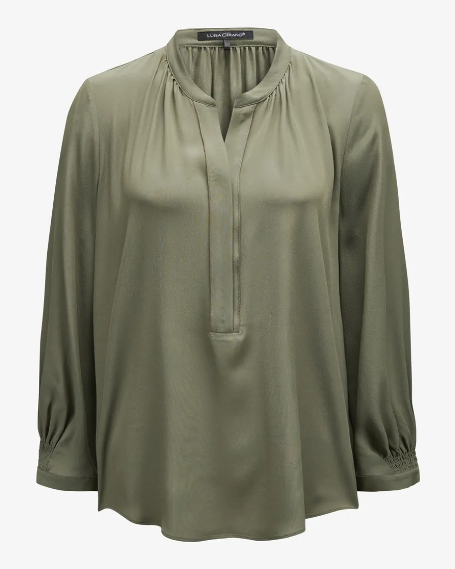Bluse für Damen von Luisa Cerano in Khaki. Das Modell begeistert mit leichtemSeiden-Mix in feiner Struktur, welche ein angenehmes Tragegefühl beschert. DerTunika-Ausschnitt sowie gesmokte Einsätze am Ärmel kreieren einen femininenGesamt-Look mit besonderem Touch.