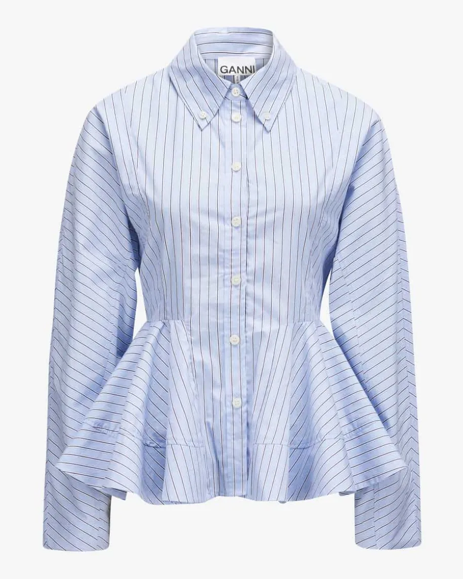 Bluse für Damen von Ganni in Hellblau, Weiß und Navy. DasModell aushochwertiger Bio-Baumwolle avanciert dank der ausgestelltenVolant-Aufmachung zuIhrem neuen Lieblings-Begleiter, welcher durch dasStreifenmuster sowie dieraffinierte Ärmel-Silhouette modisch in Szene gesetzt wird.