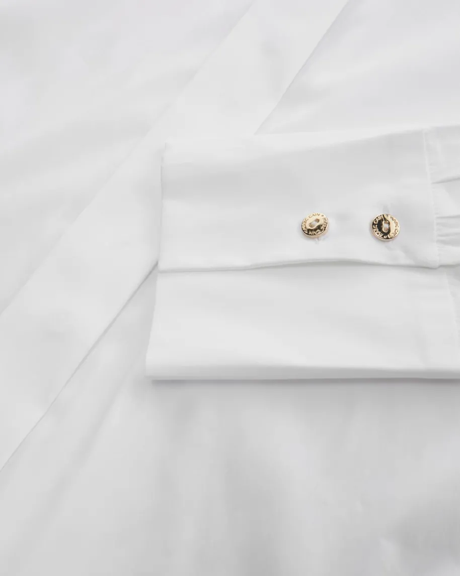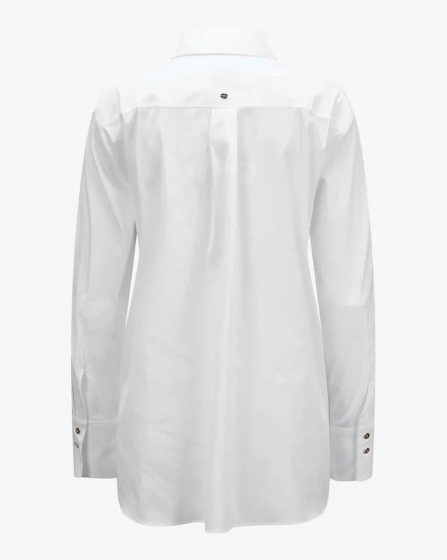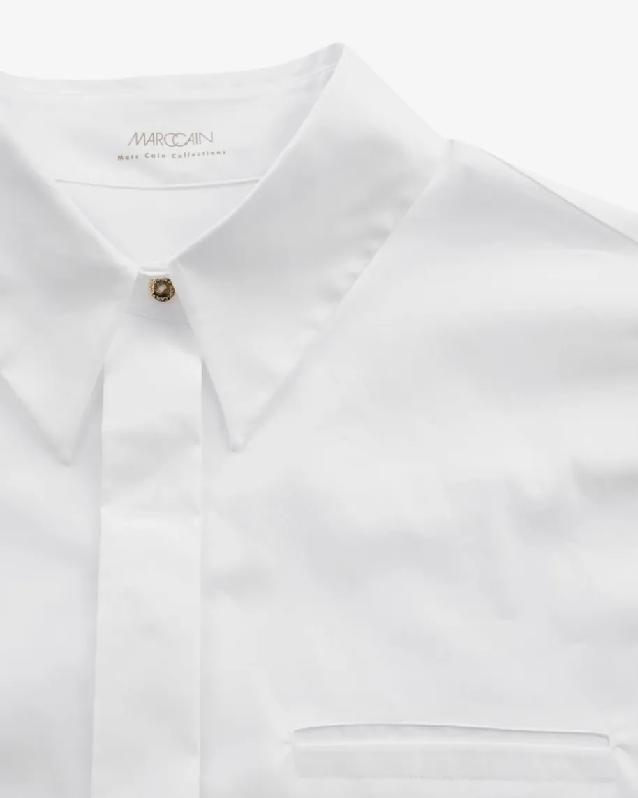 Bluse für Damen von Marc Cain in Weiß. Das Modell begeistert mit verlängerterPassform und klassischen Details, während die verdeckte Knopfleiste eleganteAkzente setzt. Die goldfarbenen Knöpfe runden den Look zusammen mit derdekorativen Paspeltasche auf der Brust stilvoll ab.
