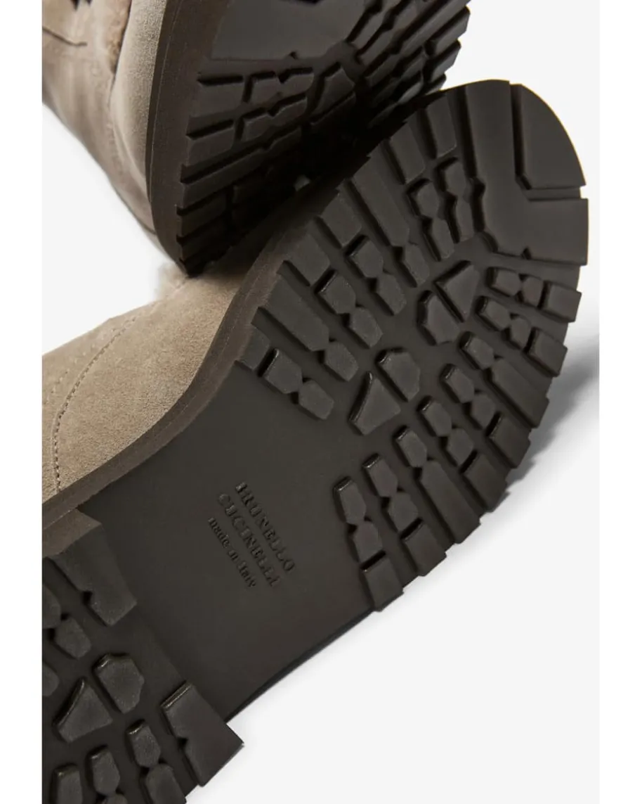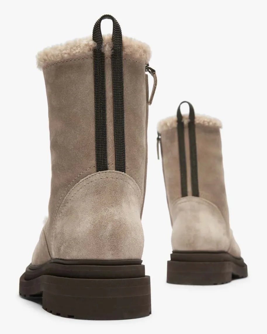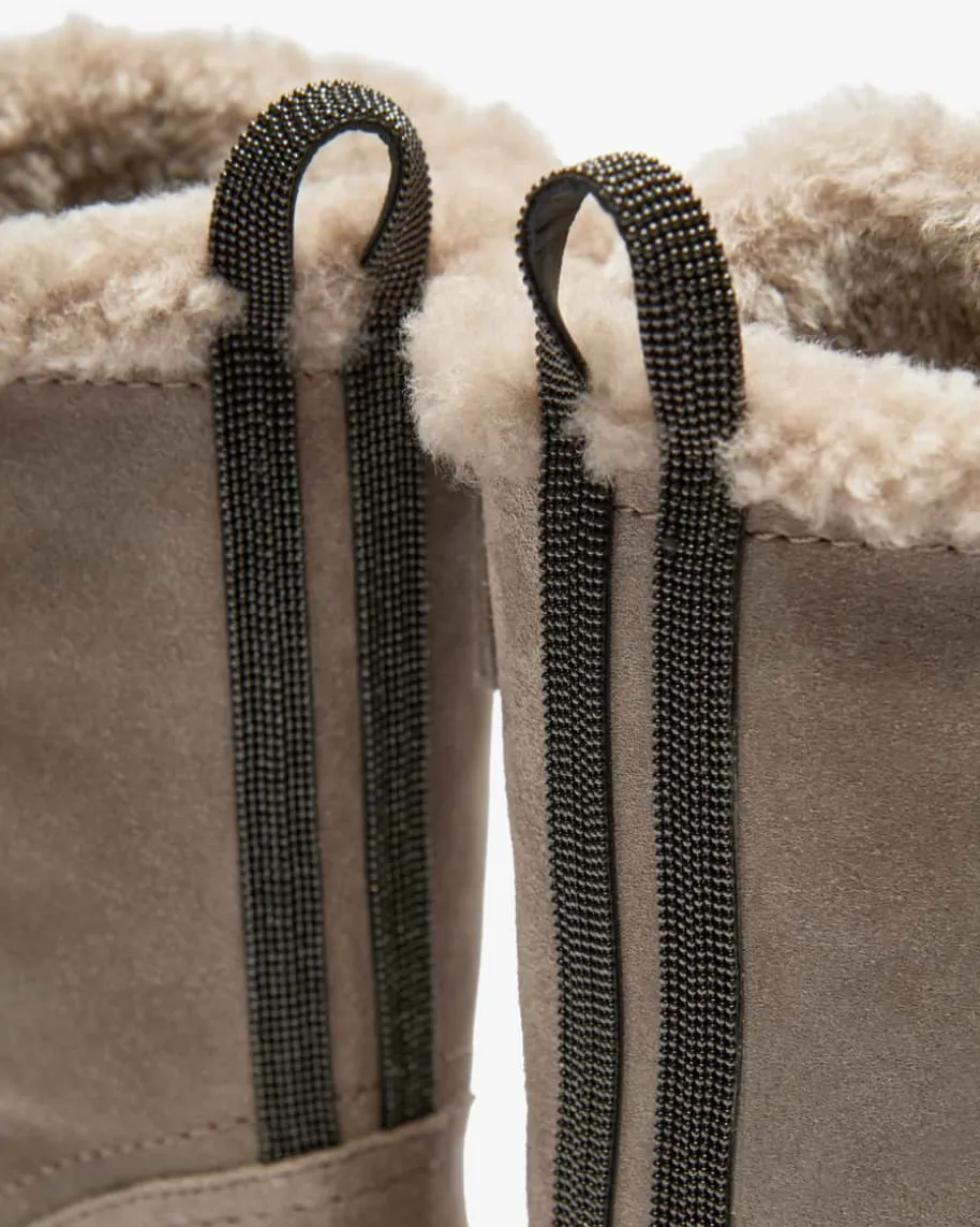 Boots für Damen von Brunello Cucinelli in Taupe. Das Modell zeichnet sich durchdie hochwertige Veloursleder-Qualität mit weichem Lammfellfutter aus, wodurchein wärmender und zugleich moderner Begleiter im Equestrian-Stil entsteht. Dierückseitigen Schmuckketten-Applikationen verleihen zudem eine edle Note undspiegeln das Label gekonnt wider.