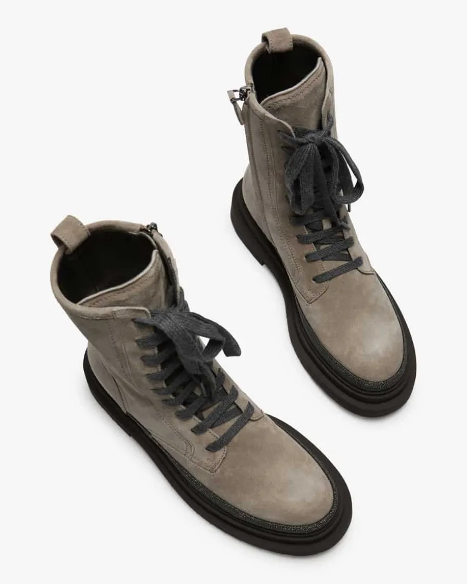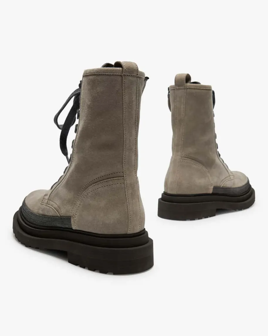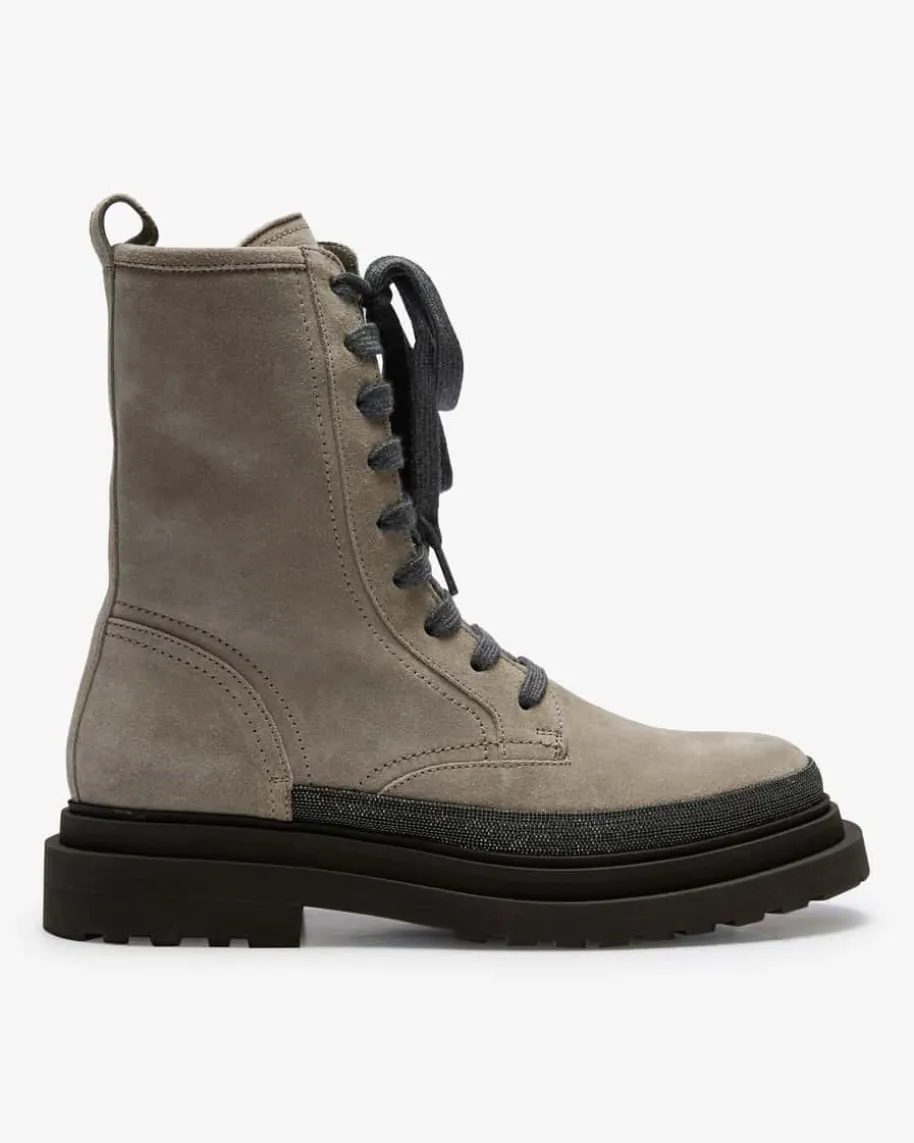 Boots für Damen von Brunello Cucinelli in Grau. Das Modell zeichnet sich durchdie hochwertige Veloursleder-Qualität aus, während changierende Ketten-Applikationen für das gewisse Etwas sorgen und zugleich das Label gekonntwiderspiegeln.