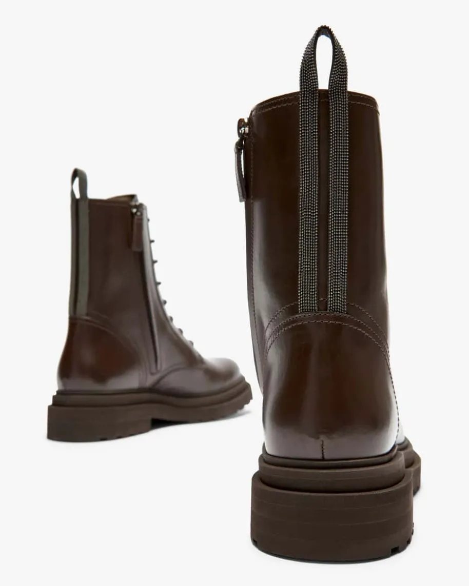 Boots für Damen von Brunello Cucinelli in Dunkelbraun. Das Modell zeichnet sichdurch die hochwertige Glattleder-Qualität und feminine Biker-Silhouette aus,wodurch ein robuster sowie moderner Begleiter mit Equestrian-Flair entsteht. Dierückseitigen Schmuckketten-Applikationen verleihen zudem eine edle Note undspiegeln das Label gekonnt wider.