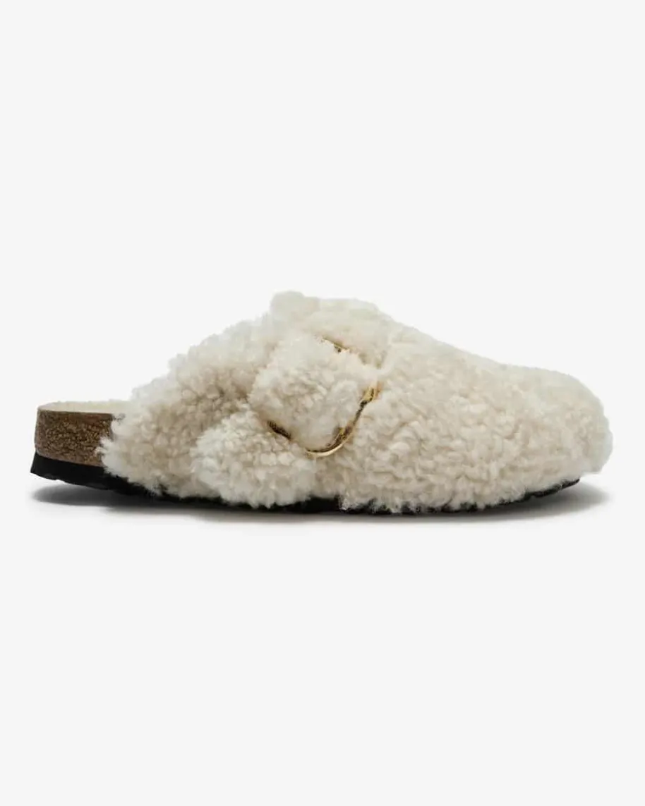 Boston Big Buckle Teddy Pantoletten für Damen von Birkenstock in Creme. Seitüber 200 Jahren revolutioniert Birkenstock die Schuhindustrie immer neu. Mitseinem einzigartigen, anatomischen Fußbett hat Birkenstock ein innovativesProduktkonzept auf den Markt gebracht, das bis heute Bestand hat. Die Lammfell-Qualität macht das Modell in Kombination mit der goldenen Dornschließe zu einemmodischen sowie bequemen Begleiter.