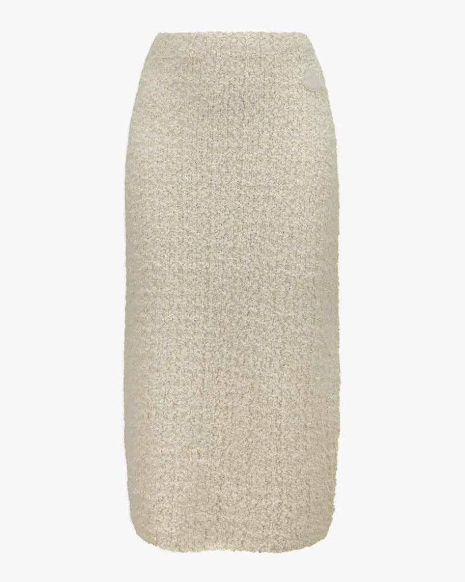 Bouclé-Strickrock für Damen von Moncler in Creme. Das Modell überzeugt mitstrukturierter Bouclé-Strick-Qualität aus hochwertigem Woll-Mix. Die elastischeVerarbeitung sorgt für angenehmen Tragekomfort und rundet den Style modisch ab.