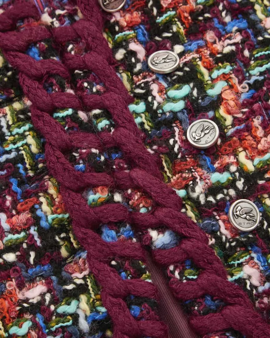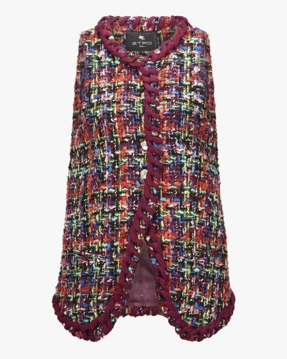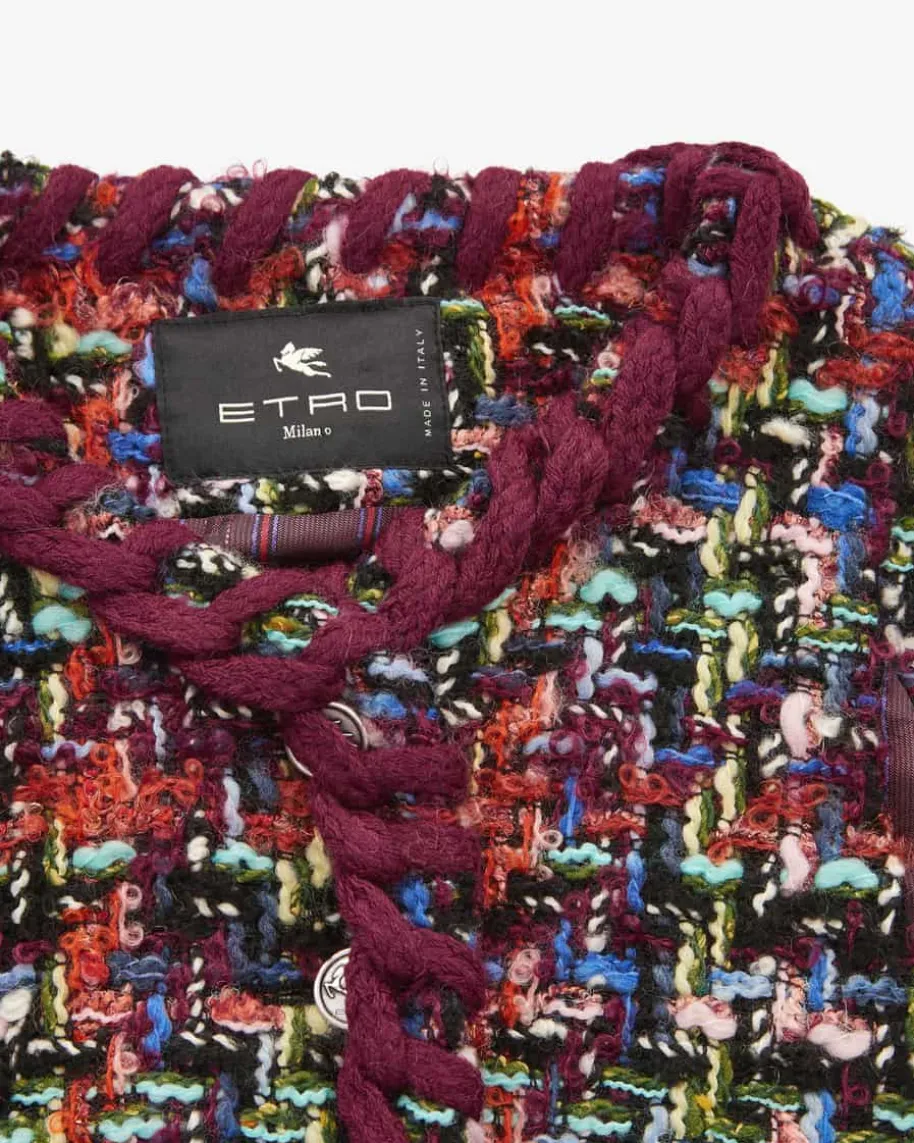 Bouclé-Weste für Damen von Etro in Bordeaux und Bunt. Das gefütterte Modell ausschwerem Woll-Mix punktet dank der farbenfrohen Bouclé-Aufmachung mitgeflochtenen Elementen als besonderes Fashion-Highlight, welchem die Logo-Knöpfeden letzten Schliff verleihen.