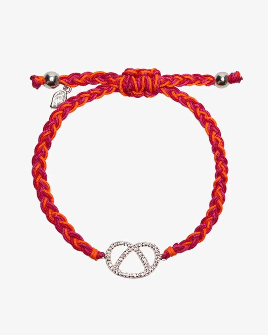 Brezn Armband für Damen von Leaf in Orange, Dunkelrot und Silber. Dank dersilber-rhodinierten Brezel mit Zirkonia-Besatz präsentiert sich das Modell alsmodisches Accessoire für stilbewusste Damen, während das geflochtene Bändchen imfarbenfrohen Mix einen kreativen Charakter verleiht.