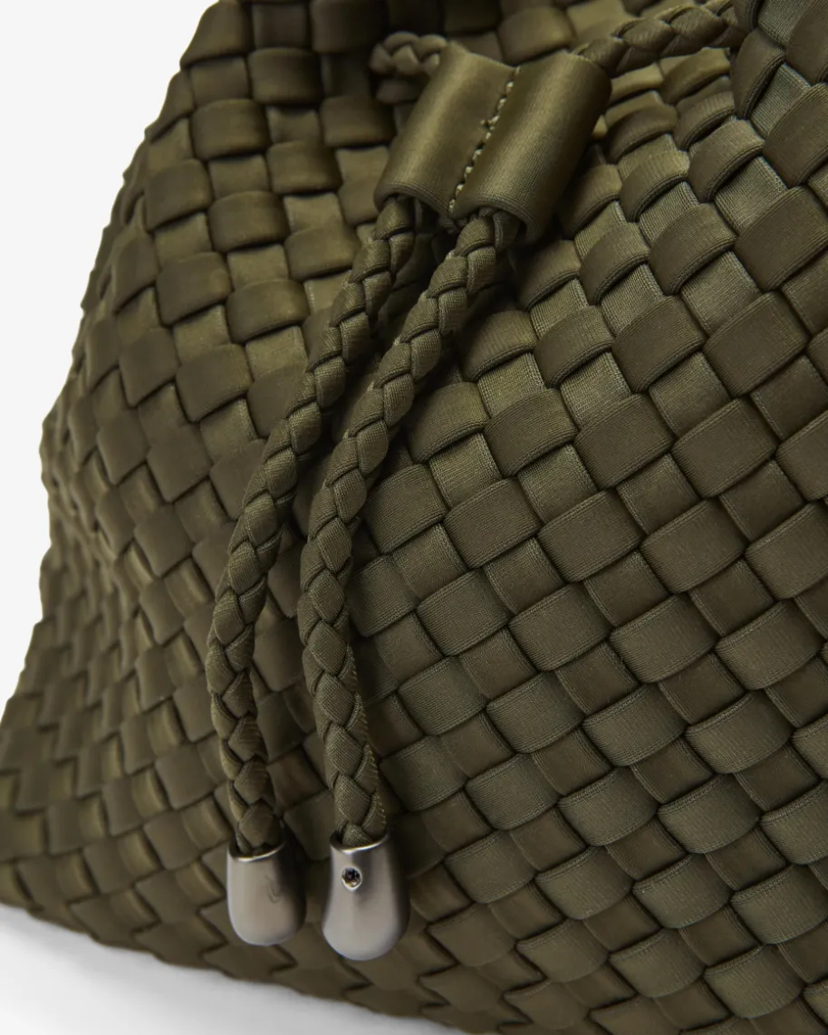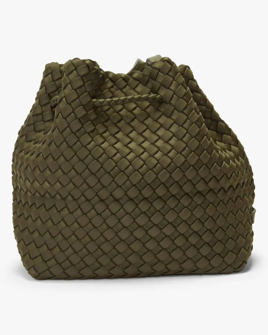 Gramercy Medium Bucket Umhängetasche für Damen von Naghedi in Oliv. Diesestextile Modell präsentiert sich in dezent changierender Optik und edler Flecht-Aufmachung, während das Bucket-Design mit Kordelzug-Verschluss einen modischenBegleiter kreiert.