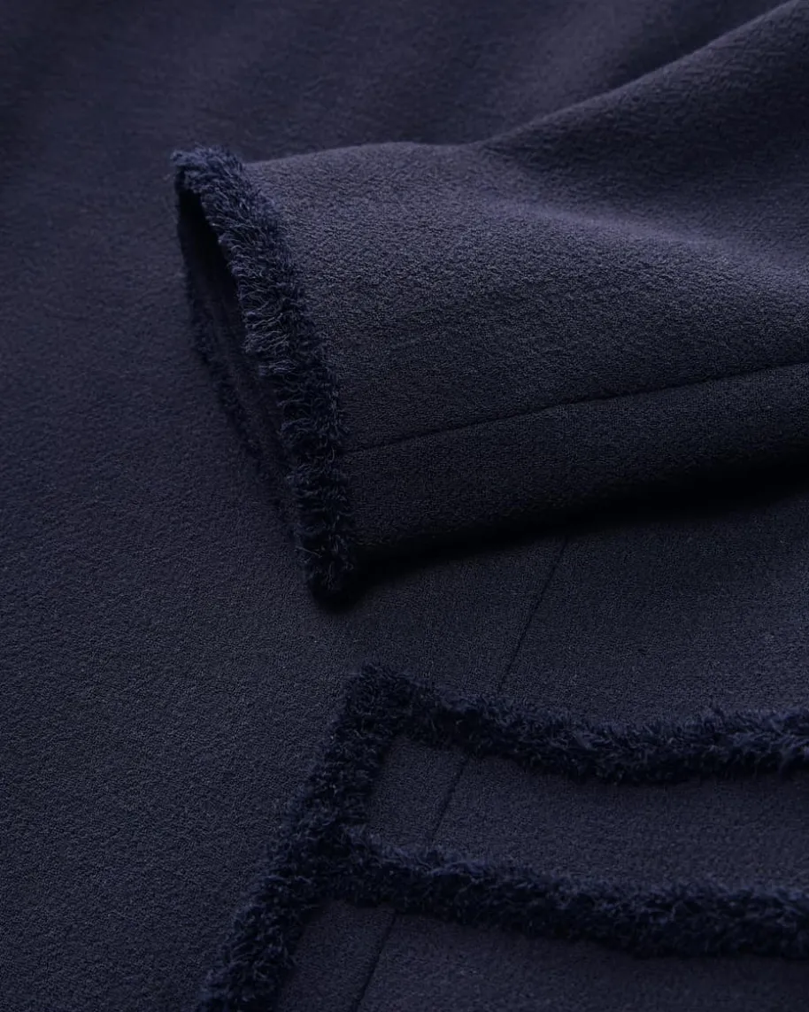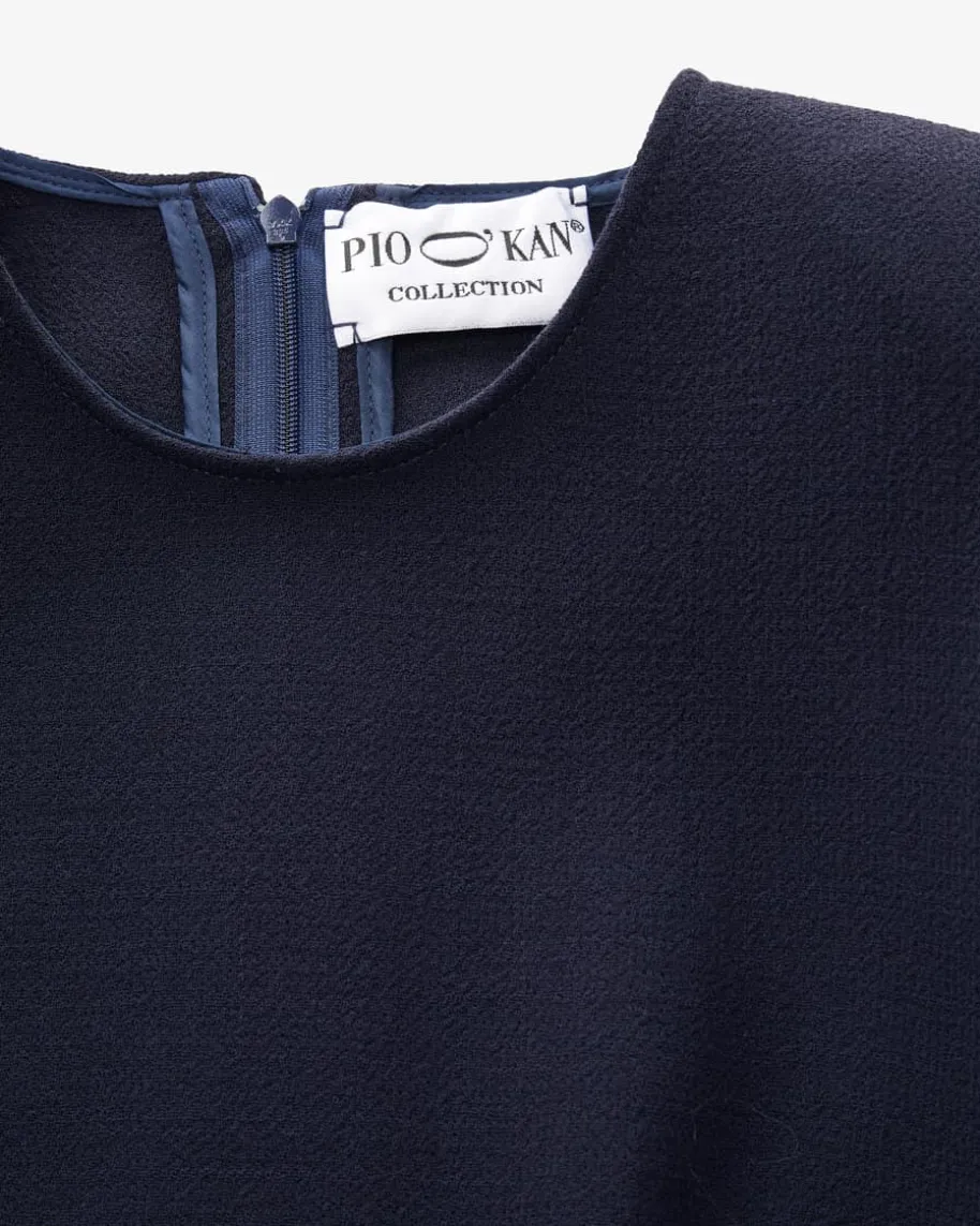 Calla Kleid für Damen von Pio O’Kan in Marine. Zeitloser Luxus und moderneEleganz prägen den Stil dieses Modells – Die taillierte Silhouette und derausgestellte Rock garantieren femininen Schwung, während die feste Double-Crepe-Qualität und tonige Fransenborten einen modernen Begleiter mit 50er Jahre Touchkreiert.