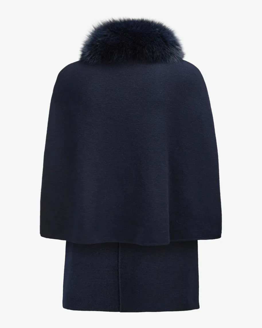 Cape für Damen von Giovi in Marine. Das Modell verspricht dank dem hochwertigenCashmere-Mix angenehme Tragemomente, während der Fuchspelz-Besatz am Kragen demDesign eine elegante Note verleiht.