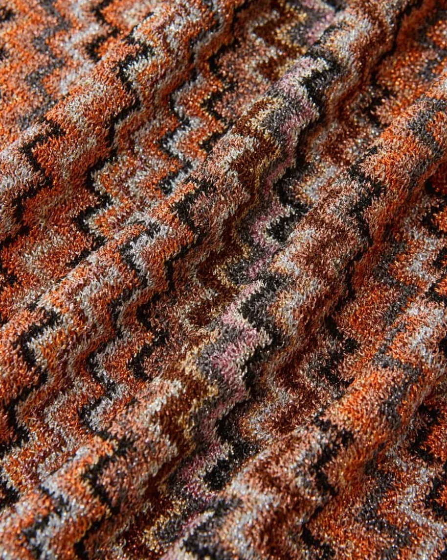 Cape für Damen von Missoni in Braun, Orange und Schwarz. Mit metallischenGlitzerfasern präsentiert sich dieses Modell in changierender Strick-Aufmachung,welcher das Label dank des Zick-Zack-Musters gekonnt widerspiegelt. Die Fransen-Details vollenden den Look harmonisch.