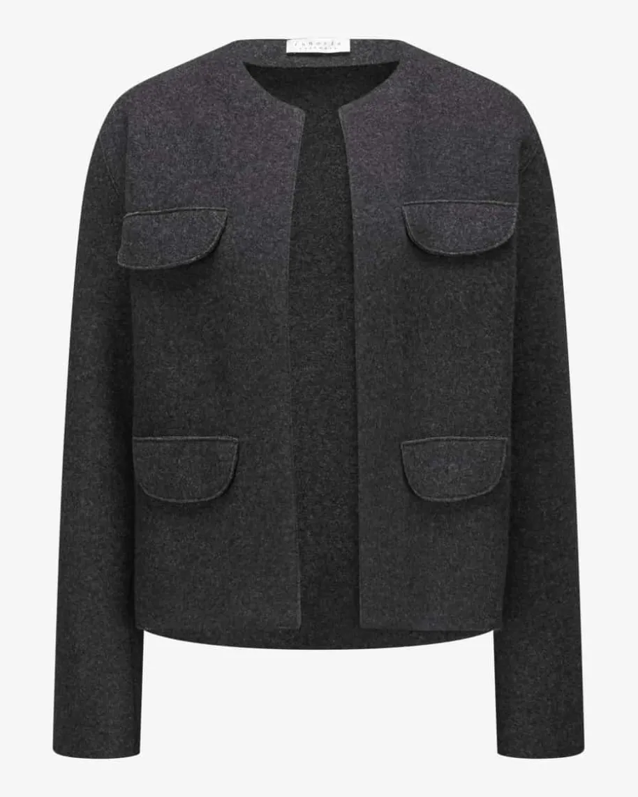 Cashmere-Jacke für Damen von Lunaria in Anthrazit. Pure Exzellenz aus Italien –Diese ungefütterte Blazerjacke aus weicher Cashmere-Qualität begeistert mitlegerer Schnittführung, welche durch die dekorativen Klappentaschen sowie denoffenen Verschluss gekonnt unterstrichen wird und so zum vielseitigen Begleiterfür stilvolle Looks avanciert.