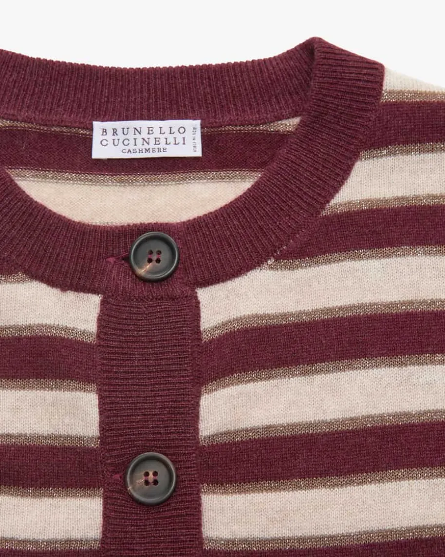 Cashmere-Strickjacke für Damen von Brunello Cucinelli in Bordeaux, Beige undGold. Das Modell präsentiert sich mit klassischem Streifenmuster in Wine- undBeige-Nuancen, während die eingearbeiteten Glitzerfasern in changierender Optikeinen modischen Look kreieren. Die leichte und weiche Cashmere-Verarbeitungsorgt für angenehme Tragemomente und rundet den Style harmonisch ab.