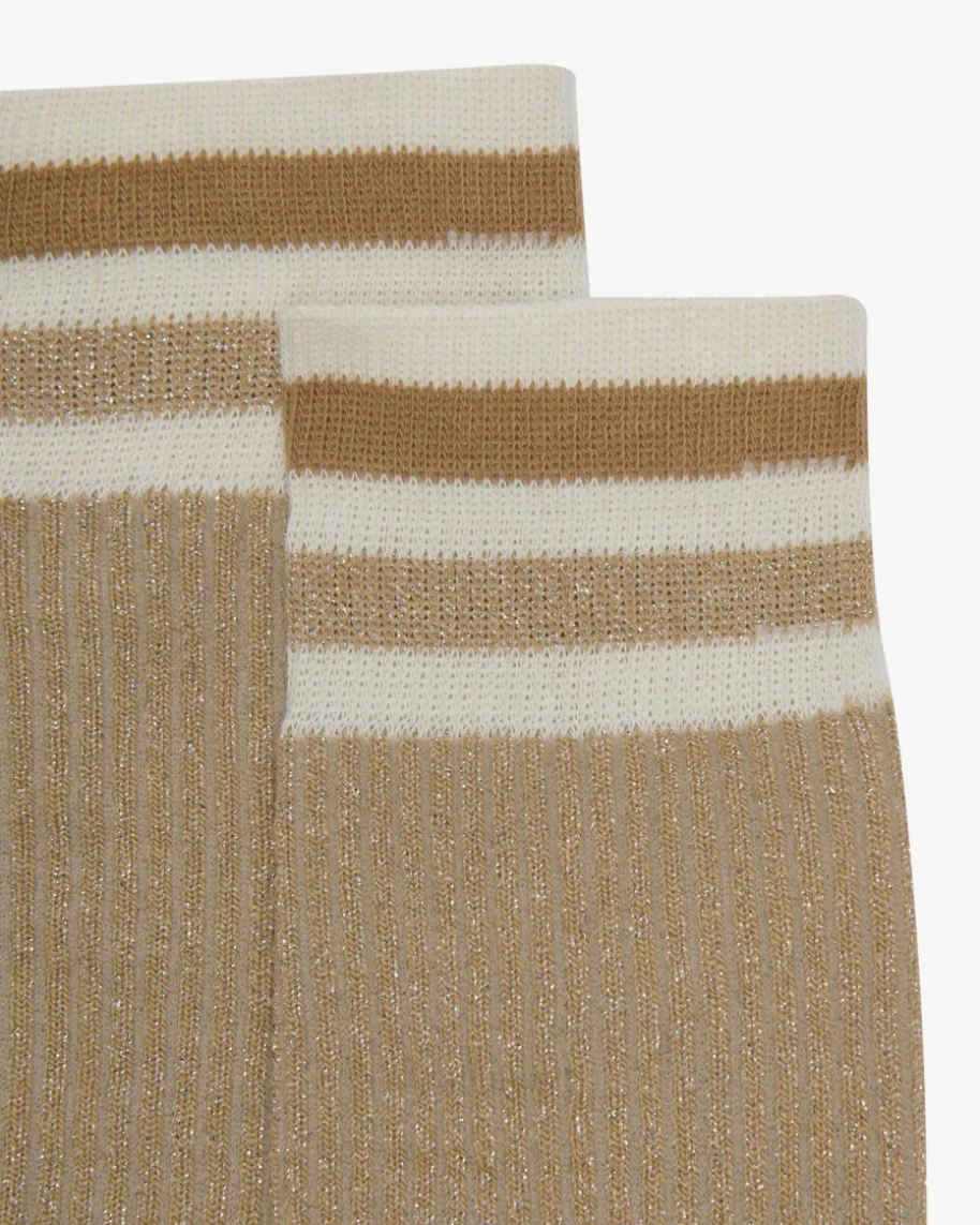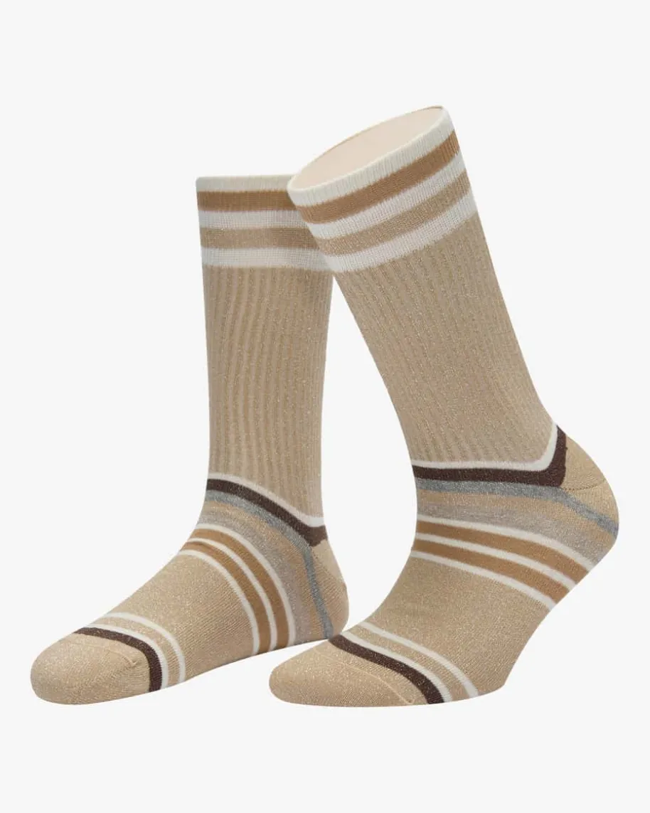 Chapo Strümpfe für Damen von Alto in Sand, Braun und Weiß. Made in Italy – 1923gegründet, zeichnet das Unternehmen die Verbindung von Tradition und Exzellenzaus. Die Socke ist nicht nur ein Modeaccessoire, sondern interpretiert den Stilund die Persönlichkeit des Trägers. Auch dieses elastische Modell begeistertdank changierenden Glitzerfasern und Streifenmuster in modischer Aufmachung.