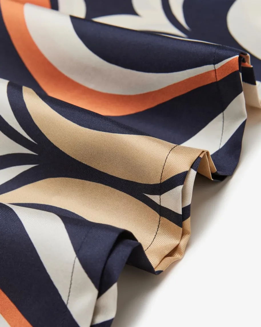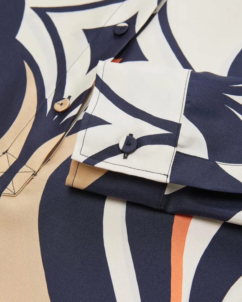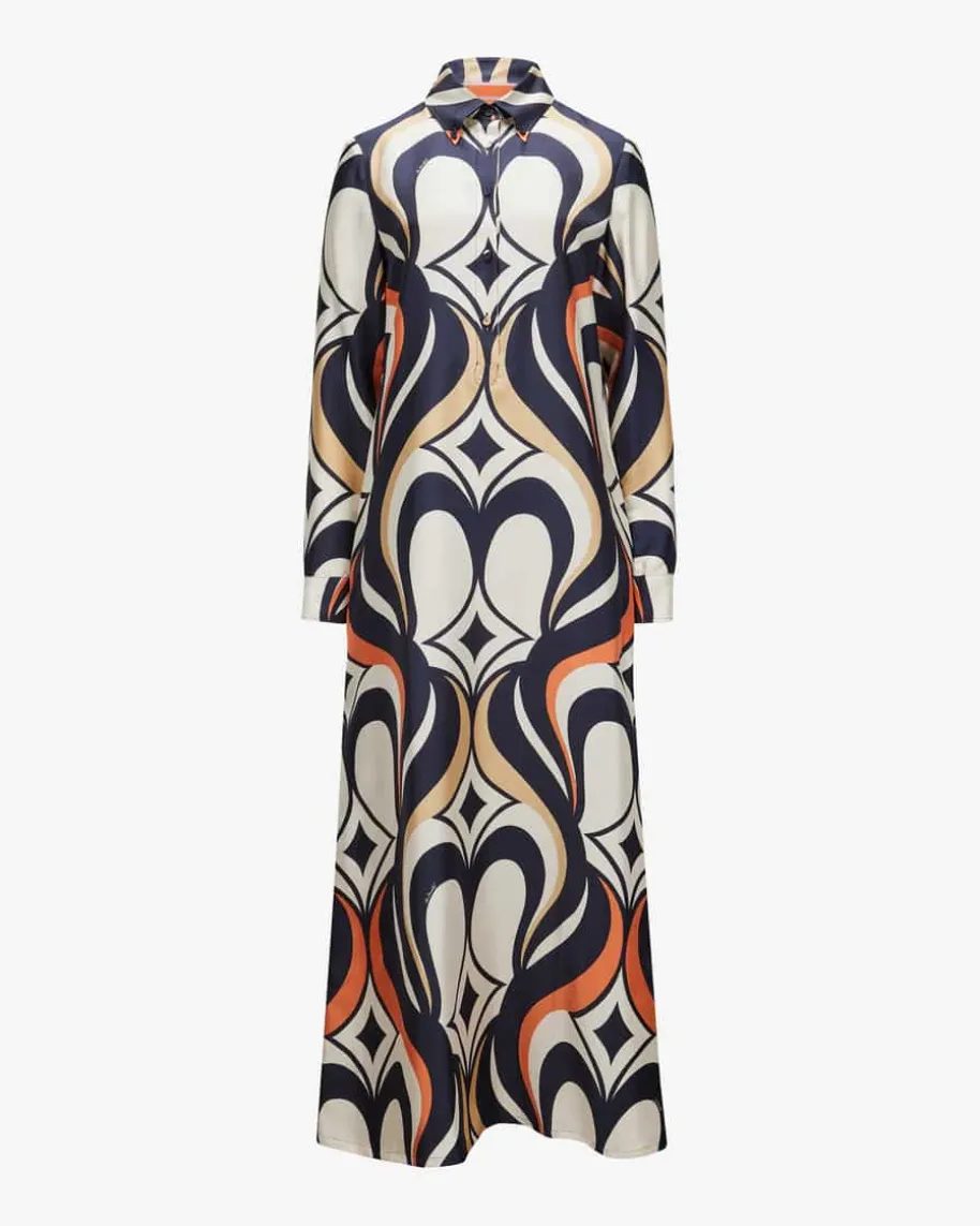 Chemise Swing Seidenkleid für Damen von La DoubleJ in Navy, Beige und Orange.Das Modell präsentiert sich dank der klassischen Passform und in femininerAufmachung, während der kreative Ornament-Print ein modisches Gesamtbild mitSinn für Stil kreiert. Die hochwertige Seiden-Qualität in Twill-Verarbeitungsorgt für angenehmen Tragekomfort und schafft eine edel fließende Optik.