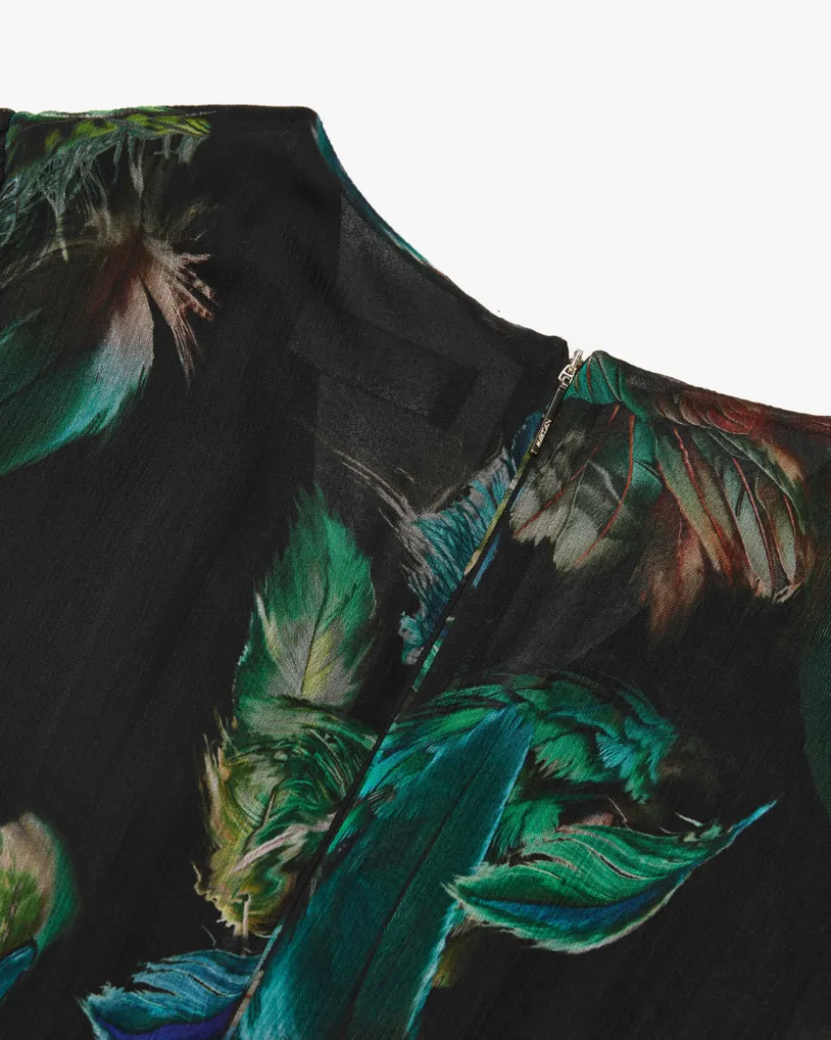 Chiffonkleid für Damen von Marc Cain in Schwarz, Jade und Blau. KombistarkeDesigns mit hohem Qualitätsanspruch – bekannt für Prints & Strick. Auch diesestaillierte Modell in semi-transparenter Aufmachung überzeugt mit femininerSilhouette, während das romantische Feder-Design den Gesamtlook gekonntvollendet.