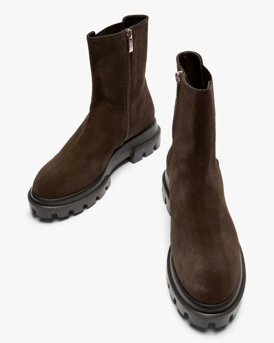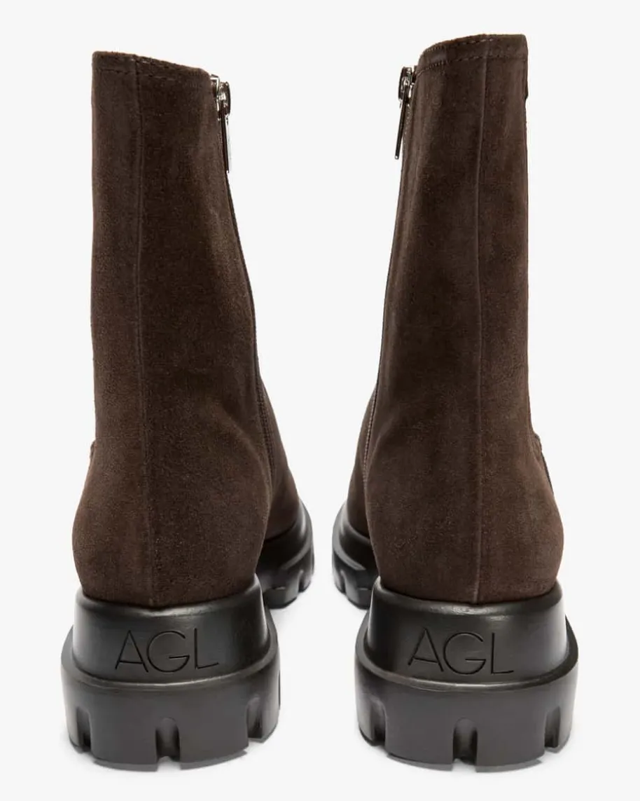 Chunky Beat Chelsea Boots für Damen von AGL in Dunkelbraun. Das Modellpräsentiert sich dank der hochwertigen Veloursleder-Aufmachung mit edler Optik,während die markante Profilsohle modische Akzente setzt. Der elastische Einsatzauf der Schaft-Außenseite rundet den Look gekonnt ab.
