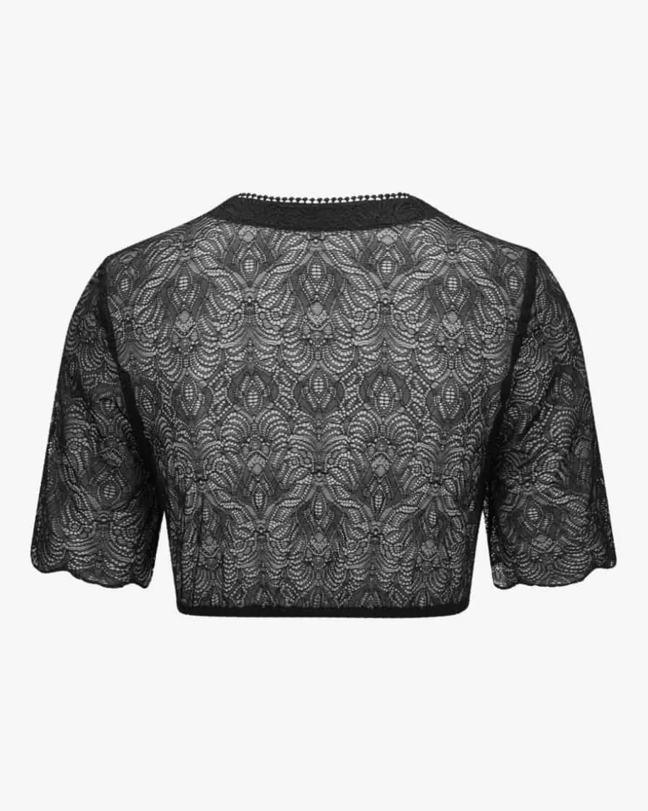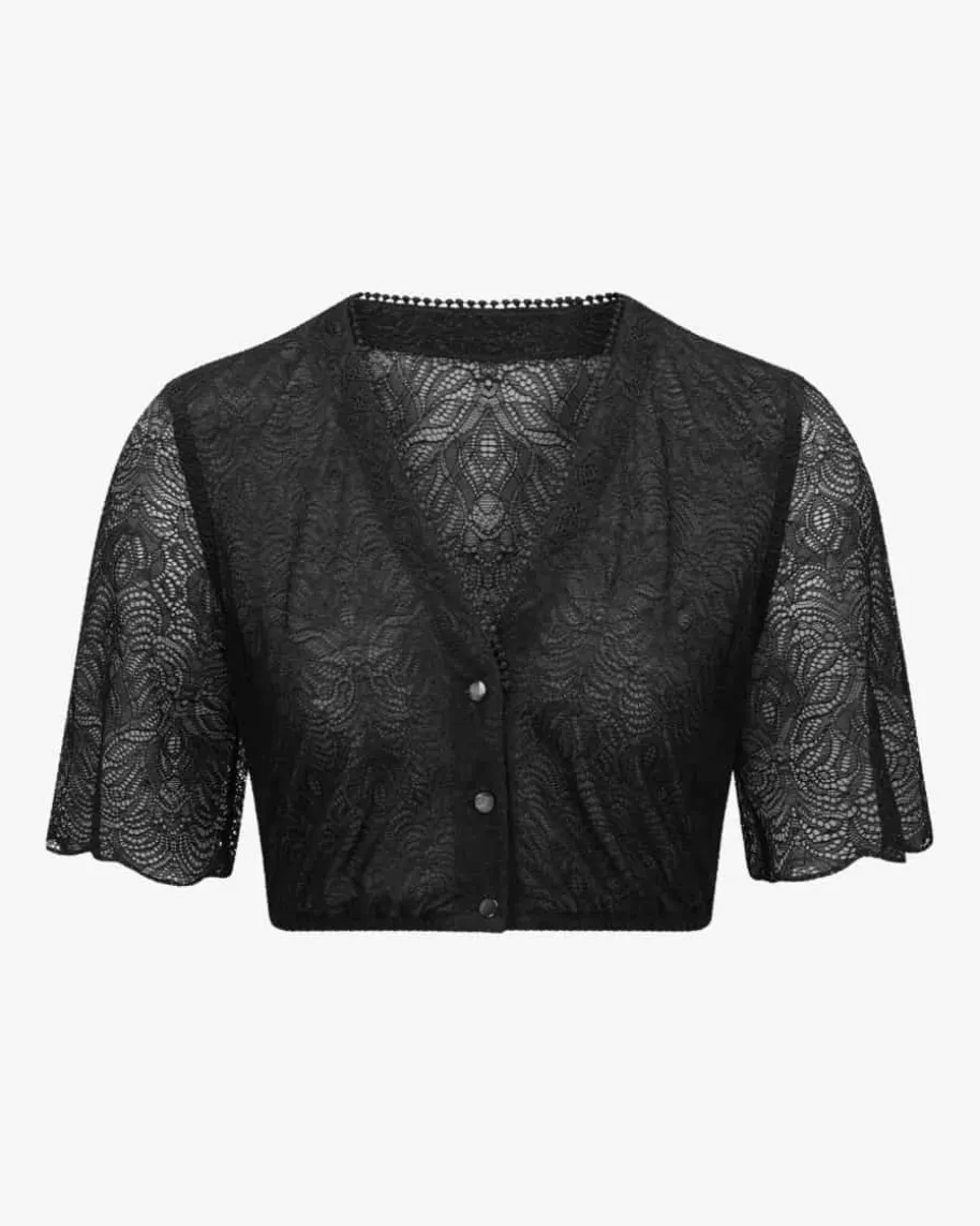 Clara Dirndlbluse für Damen von LODENFREY in Schwarz. Das Modell zeichnet sichdurch die semi-transparente Spitzen-Qualität aus elastischem Material aus,welche dank feinem floralem Muster stilvoll ergänzt wird – Ein romantischerBegleiter für Ihren Trachten-Look.