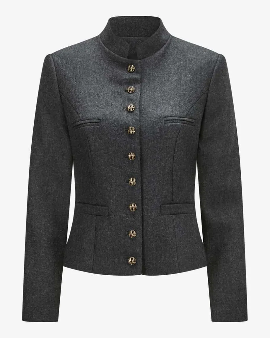 Constanze Trachtenblazer für Damen von Kinga Mathe in Anthrazit. Das Modellüberzeugt dank hochwertiger Schurwolle in traditioneller Aufmachung, welchedurch klassische Details sowie die Ziernähte eine feminine Passform erhält. Dieraffinierten Knöpfe runden den stilvollen Look harmonisch ab.