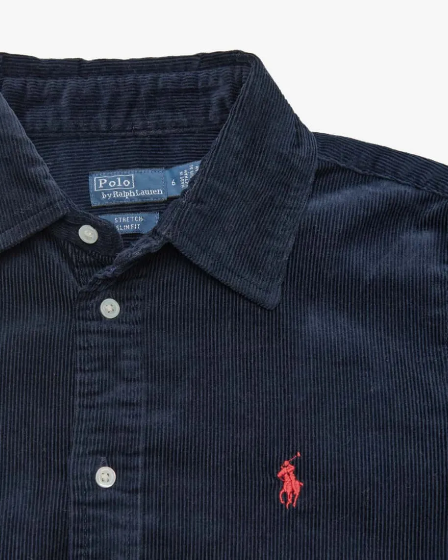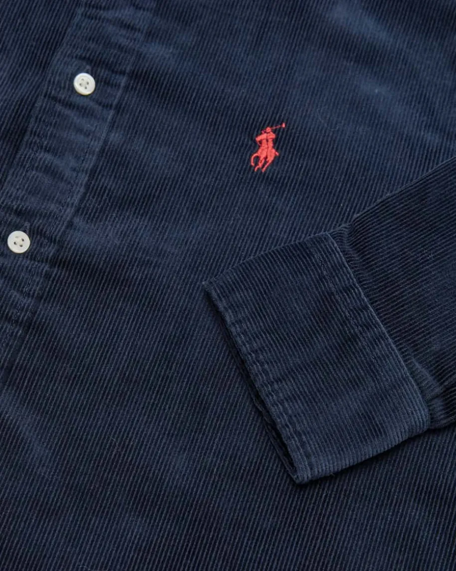 Cord-Hemdbluse Slim Fit für Damen von Polo Ralph Lauren in Navy. Das Modellpräsentiert sich dank der soften Cord-Qualität als moderner Favorit imOvershirt-Stil, welcher durch die kontrastierende Poloreiter-Stickereilabeltypisch inszeniert wird.