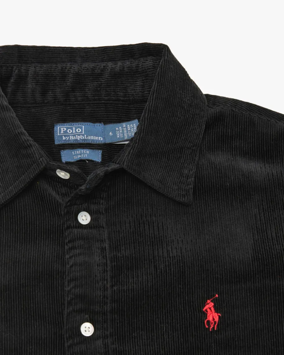 Cord-Hemdbluse Slim Fit für Damen von Polo Ralph Lauren in Schwarz. Das Modellpräsentiert sich dank der soften Cord-Qualität als moderner Favorit imOvershirt-Stil, welcher durch die kontrastierende Poloreiter-Stickereilabeltypisch inszeniert wird.