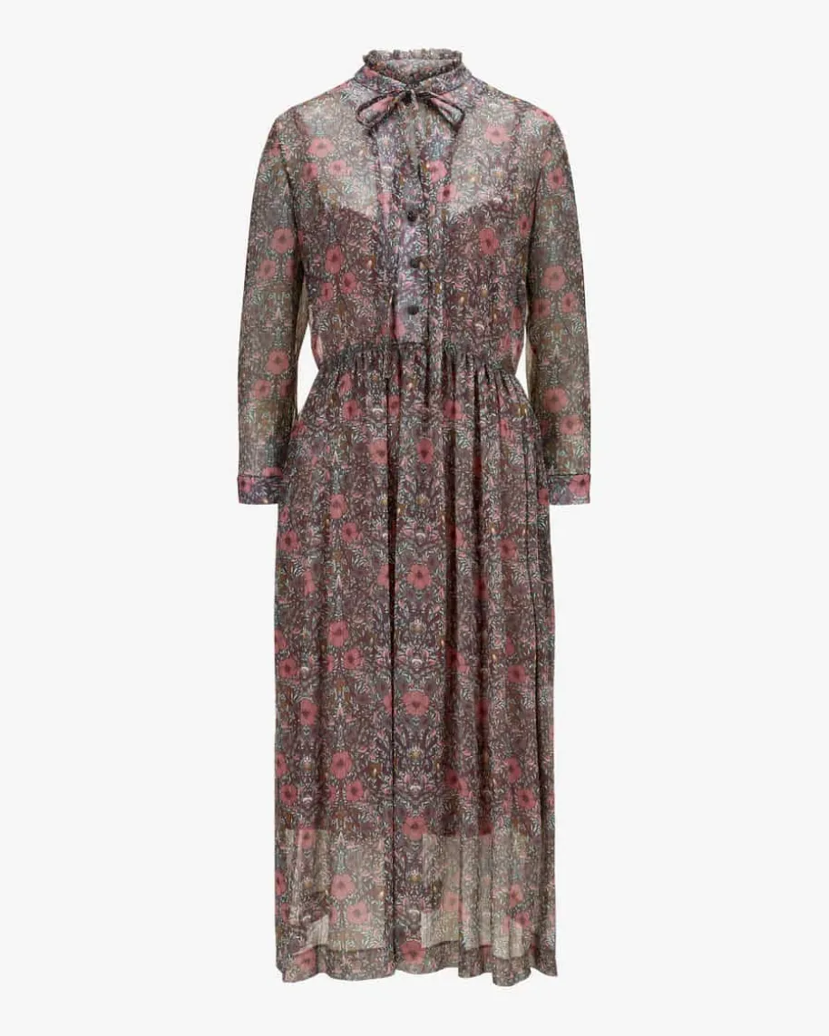 Corinne Kleid für Damen von Kinga Mathe in Blaugrau, Altrosa und Violett. DasModell besticht dank floralem Allover-Dessin in moderner Aufmachung, währendRüschen-Details und Glitzer-Fasern besondere und feminine Akzente setzen.