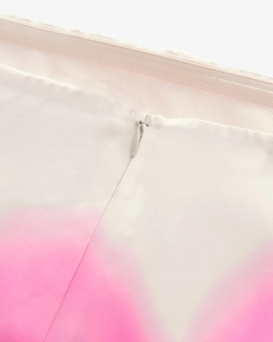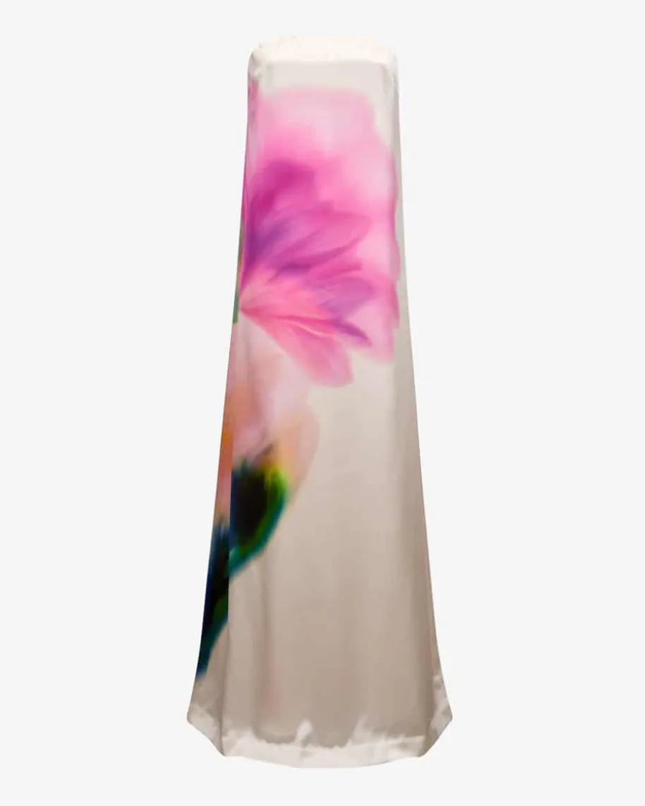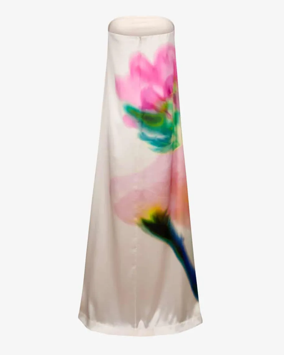 Dahlia Seidenkleid für Damen von Rebecca Vallance in Champagner, Pink und Bunt.Das Maxi-Modell überzeugt durch das trägerlose Bandeau-Design und die fließendeSeiden-Qualität als hochwertiger Eyecatcher, während der abstrakt-florale Printin Aquarell-Optik für einen besonderen Twist sorgt.