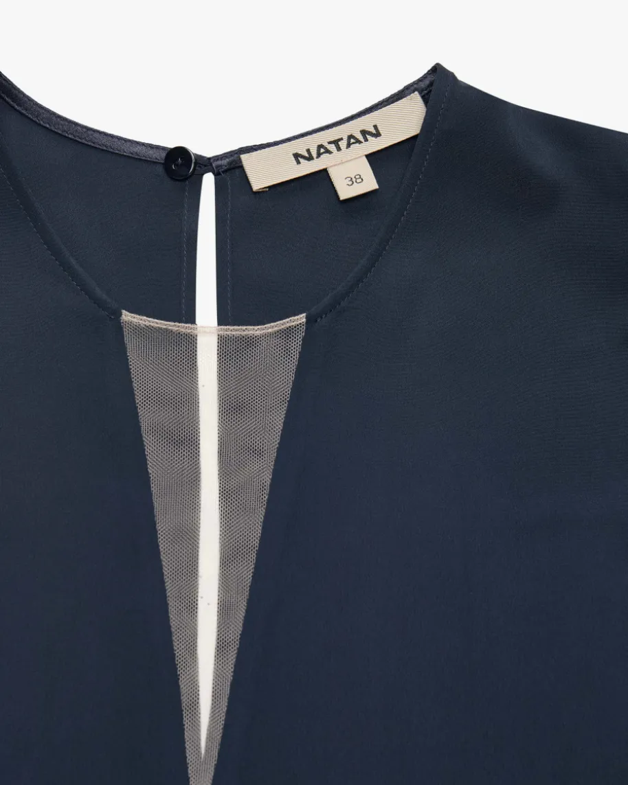 Daphi Kleid für Damen von Natan in Marine. Das Modell zeichnet sichdurch die fließende Verarbeitung mit Seide aus, welche sowohl haptisch als auchoptisch überzeugt. Das abnehmbare Cape mit Stehkragen und feinen Raffungenrundet den extravaganten Abend-Look gekonnt ab.