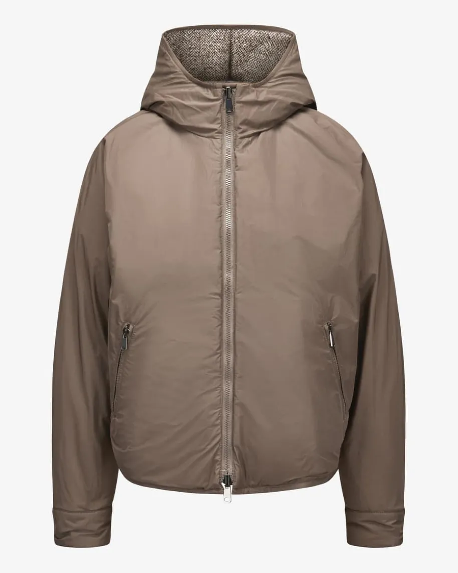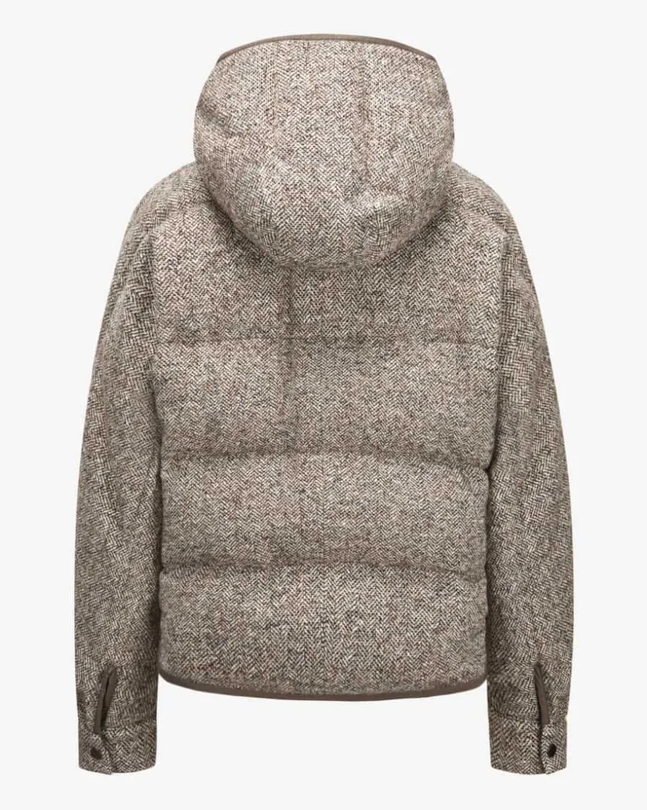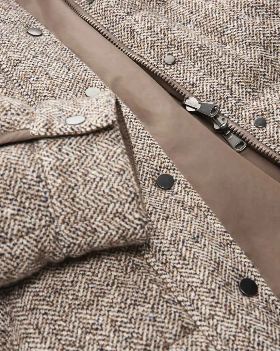 Daunenjacke für Damen von Brunello Cucinelli in Taupe, Navy und Creme. Mitdiesem Modell präsentiert das italienische Label dank der Daunen-Feder-Füllungeinen wärmenden Begleiter in Oversize-Passform, welcher dank dem Schurwoll-Seiden-Mix eine weiche Haptik und durch die feine Musterung zugleich moderneOptik erhält.
