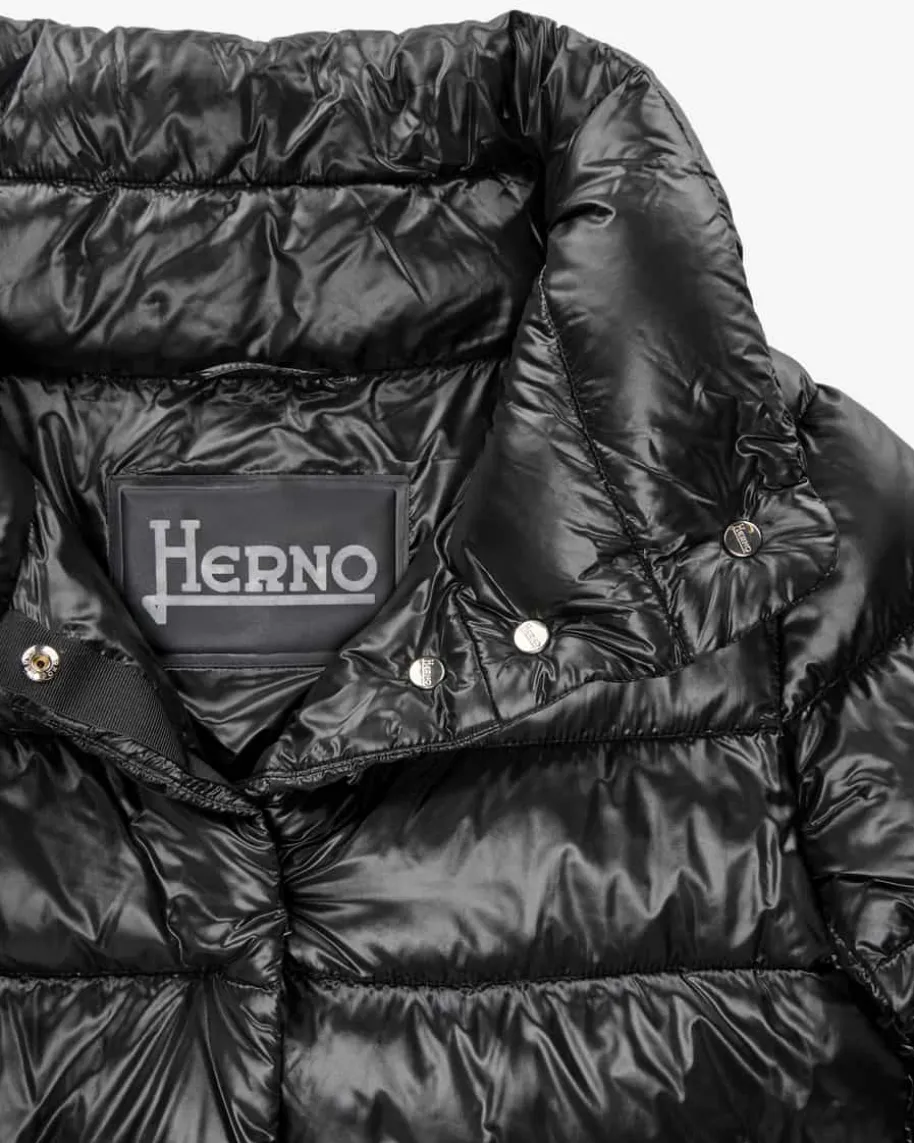 Daunenjacke für Damen von Herno in Schwarz. Das italienischeTraditionsunternehmen entwirft seit vielen Jahren luxuriöse Jacken. ZeitloseSchnitte, traumhafte Farben sowie pure Eleganz begeistern genauso, wie einehochwertige und federleichte Daunen-Fütterung. Dieses Modell begeistert zudemmit raffinierten geknöpften Seitenschlitzen und modischer, kurzer Passform.