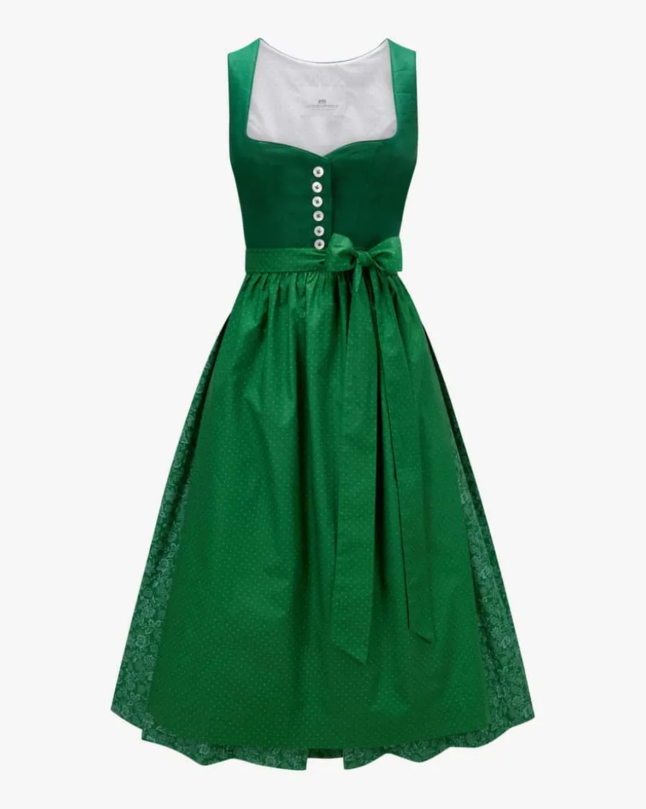 Dirndl lang mit Schürze für Damen von LODENFREY München 1842 in Dunkelgrün undFlaschengrün. Das Modell aus angenehmem Baumwoll-Leinen-Mix begeistert mitfloralem Allover-Dessin im Rock in traditioneller Aufmachung, während dasstrukturierte Leinen-Mieder sowie die gepunktete Schürze das Gesamtbildharmonisch vollenden. Ein perfekter Begleiter für stilvolle Trachten-Looks.