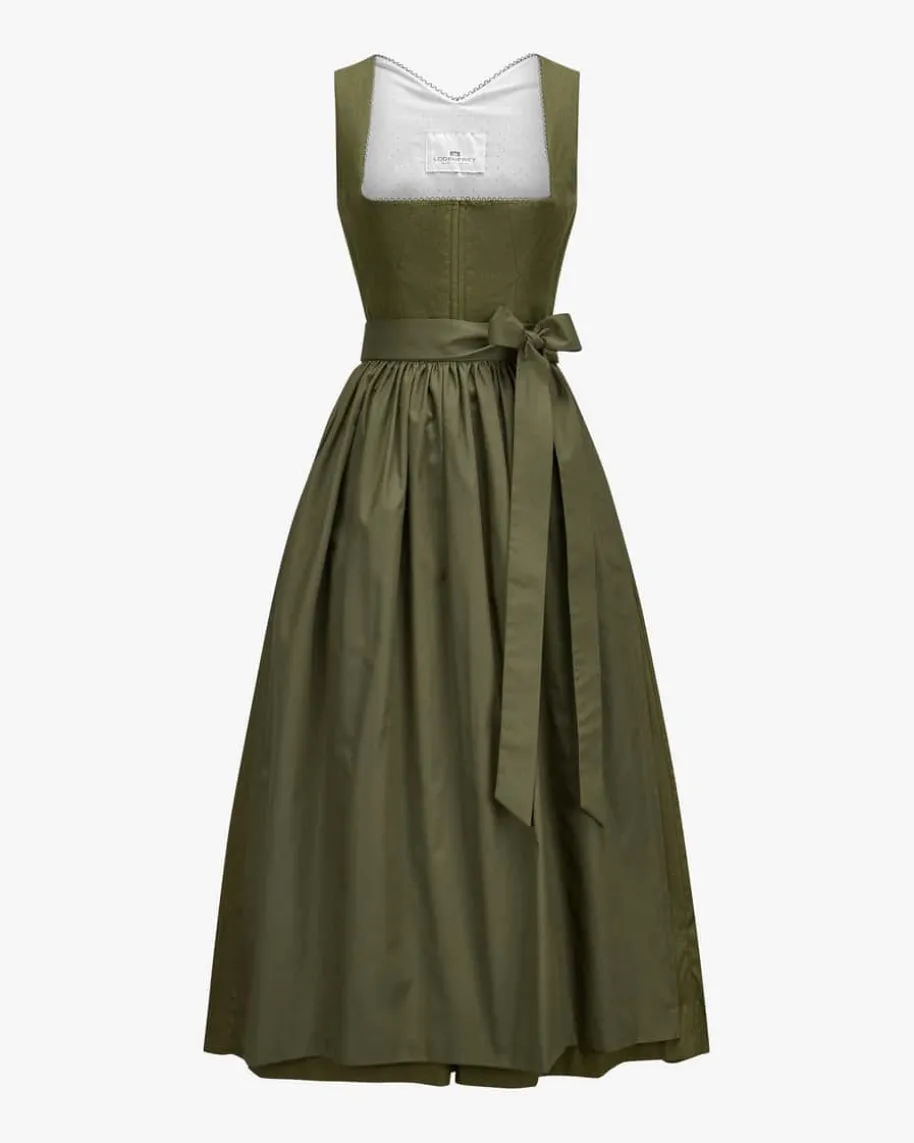 Dirndl lang mit Schürze für Damen von LODENFREY München 1842 in Oliv. Dank derVerwendung von hochwertiger Leinen-Qualität im Mieder und einem feinen Punkte-Muster im Baumwoll-Rock wird ein traditioneller Favorit mit minimalistischemCharme kreiert. Die tonige Schürze rundet das Gesamtbild harmonisch ab.