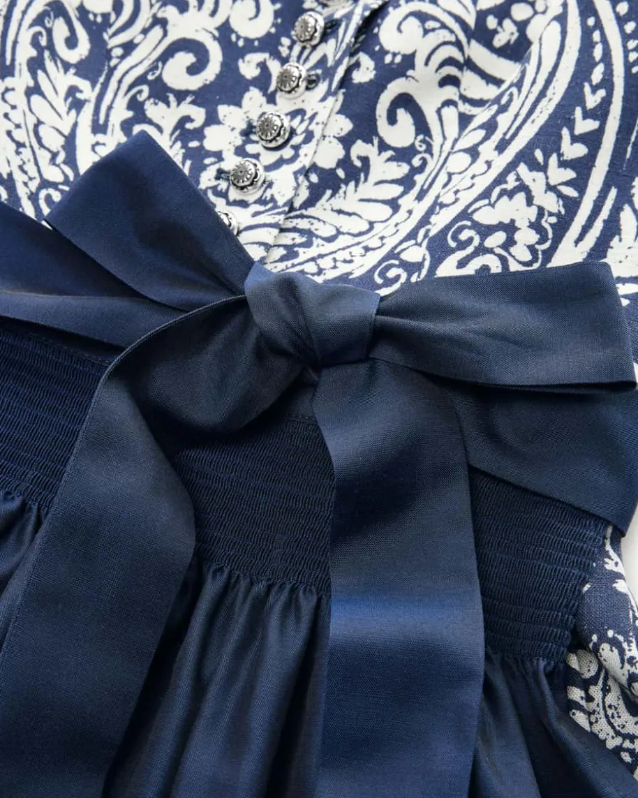 Dirndl lang mit Schürze für Damen von Sportalm in Marine und Weiß. Das Modellpunktet dank des zweifarbigen Ornament-Musters mit femininem Charme, während dieleichte Viskose-Leinen-Verarbeitung den traditionellen Charakter stilvolluntermalt. Zugleich vollendet die changierende Schürze mit Seide den Trachten-Look gekonnt.