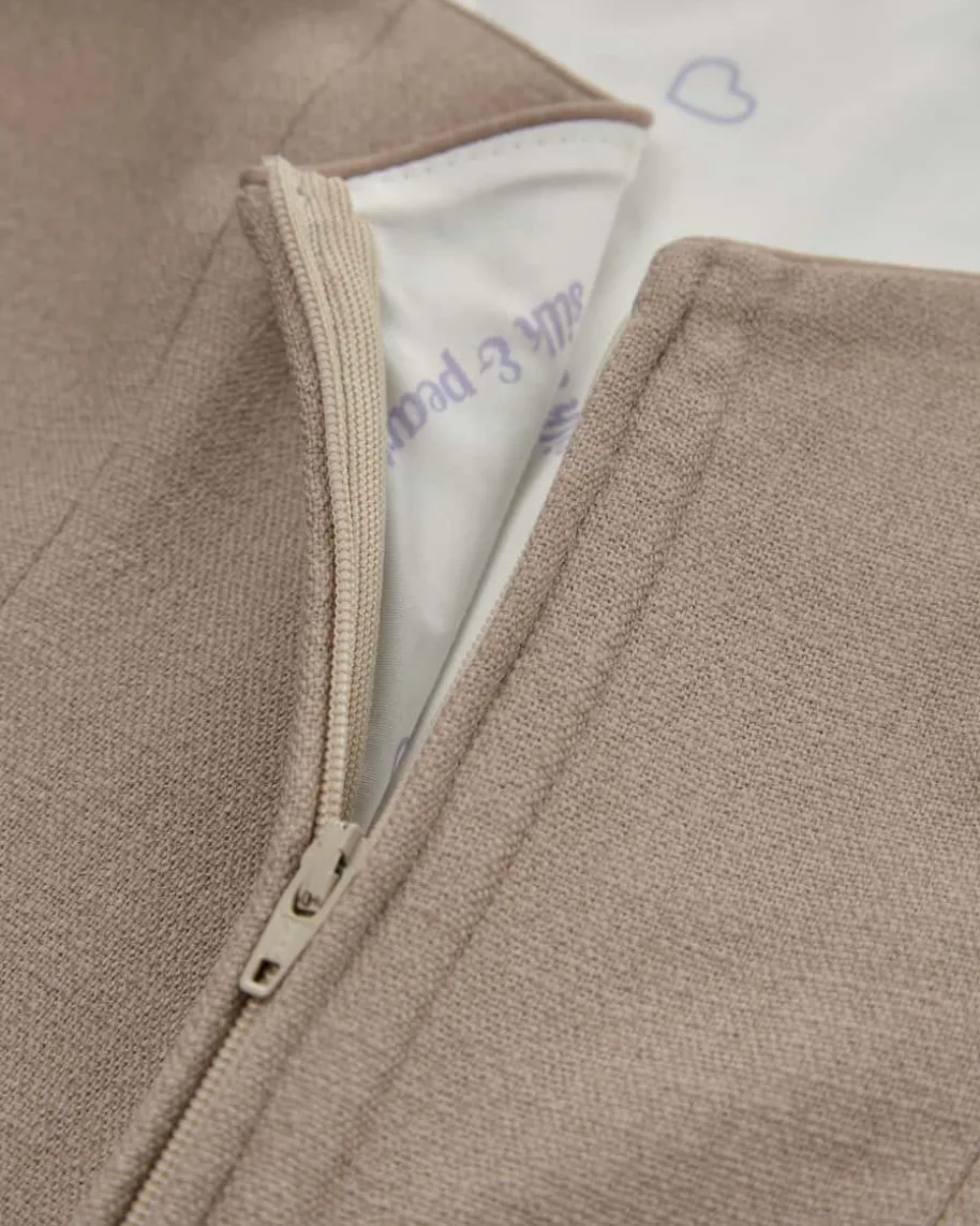 Dirndl midi mit Schürze für Damen von Silk & Pearls in Taupe. Dieses Modellschafft dank des feinen Oranmenten-Dessin und gepunkteter Schürze einenstilvollen Trachten-Look, während die tonale Paspelierung traditionelle Akzentesetzt.