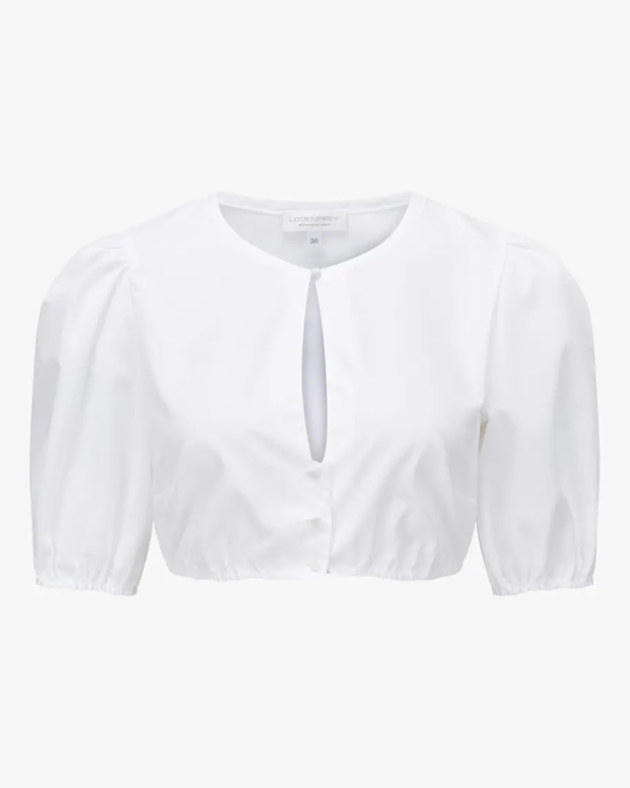 Dirndlbluse für Damen von LODENFREY in Weiß. Dieses Modell überzeugt mit cleanemDesign, das durch romantische Puffärmel und Knöpfe in Perlmutt-Optik modischergänzt wird. Das Schlüsselloch-Detail setzt zudem feminine Akzente undvollendet den Trachten-Look harmonisch.