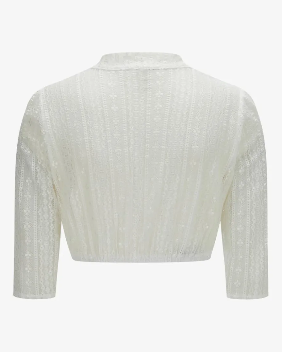 Dirndlbluse für Damen von Silk & Pearls in Weiß. Dank der semi-transparentenfloralen Spitze erhält das hochgeschlossene Modell romantische Akzente undavanciert so zum stilvollen Begleiter für Ihren Trachten-Look.