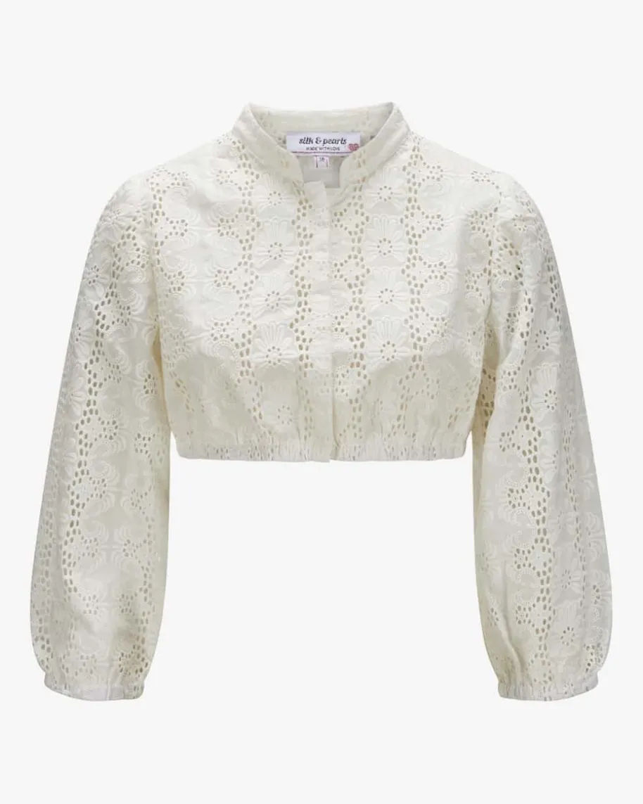 Dirndlbluse für Damen von Silk & Pearls in Weiß. Dank des floralen Lochmusterserhält das hochgeschlossene Modell romantische Akzente und avanciert so zumstilvollen Begleiter für Ihren Trachten-Look.