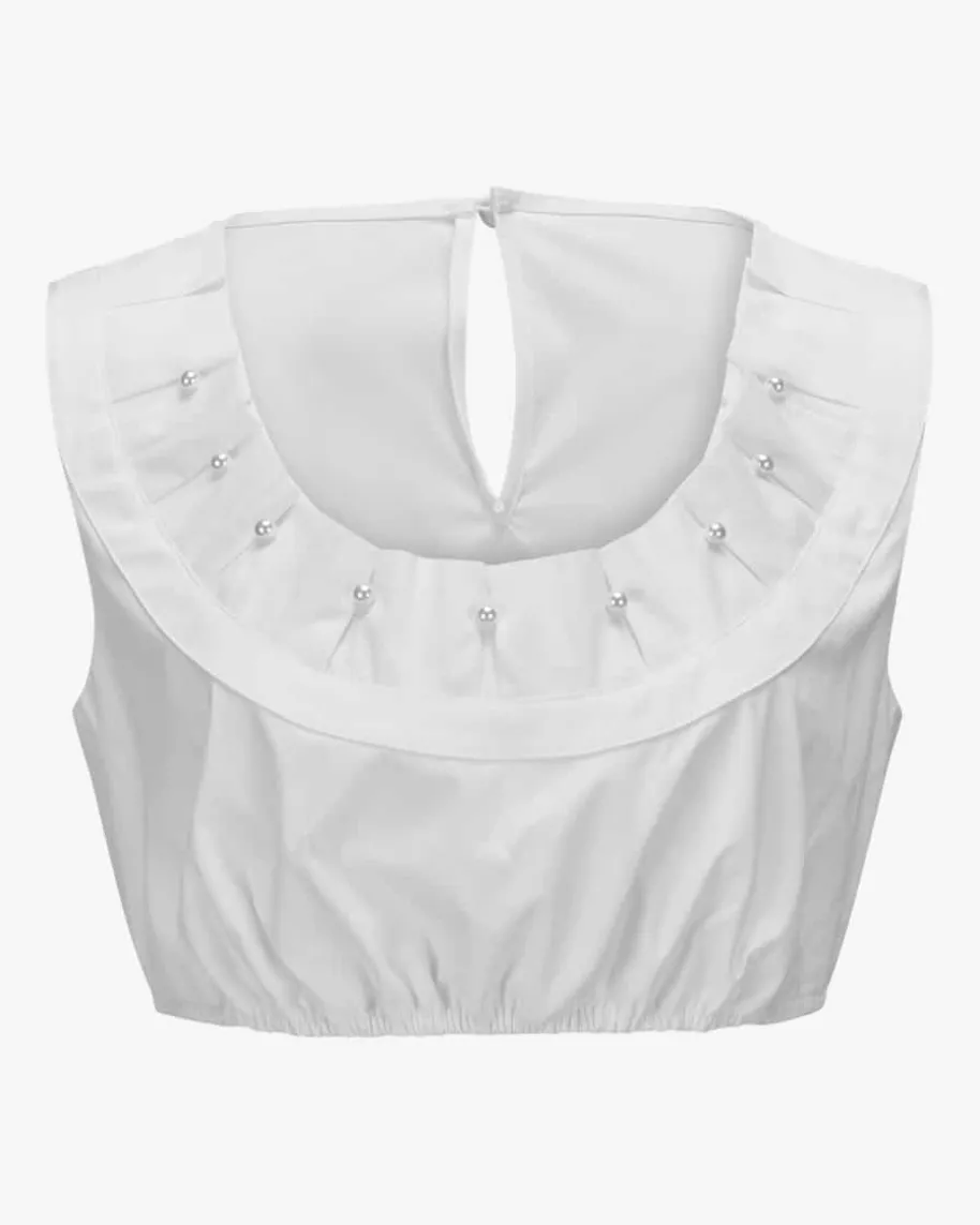 Dirndlbluse für Damen von Sportalm in Weiß. Die elastische Baumwoll-Qualitätsorgt für eine angenehme Haptik, während der in Falten gelegte Ausschnitt mitchangierenden Perlen den Dirndlbegleiter elegant ergänzt.
