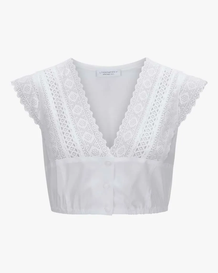 Dirndlbluse für Damen von LODENFREY in Weiß. Das Modell begeistert mitangenehmer Baumwoll-Qualität, während der zarte Spitzen-Einsatz mit dezentenFlügel-Ärmeln das Gesamtbild harmonisch vollendet. Ein perfekter Begleiter fürstilvolle Trachten-Looks.