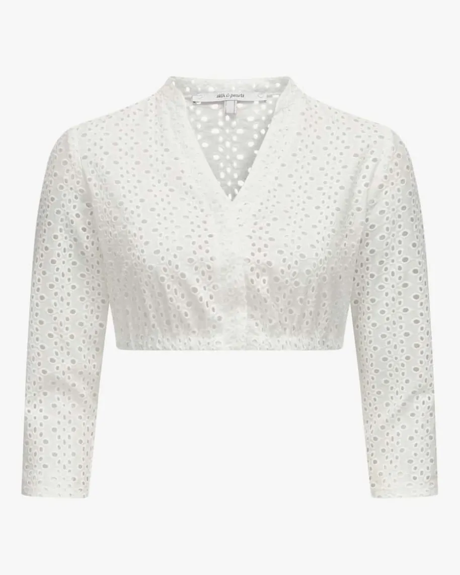Dirndlbluse Semi-Transparent für Damen von Silk & Pearls in Weiß. Das Modellbegeistert dank der semi-transparenten Lochspitze in traditionellem Charme,während die klassische Passform mit dezentem Stehkragen einen vielseitigenDirndl-Favoriten für Trachten-Looks kreiert.