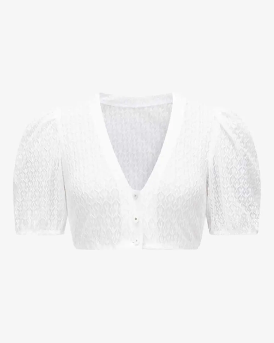 Dirndlbluse für Damen von LODENFREY in Weiß. Das Modell punktet dank der semi-transparenten, strukturierten Material-Qualität in modischer Aufmachung, währenddie femininen Puffärmel das traditionelle Gesamtbild stilvoll inszenieren.